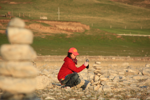 羡慕!可惜我们没有那么多的时间!她一个人在那儿专注的拍着尼玛石堆,红衣、红帽,在朝阳 中显的格外的美丽~~~
