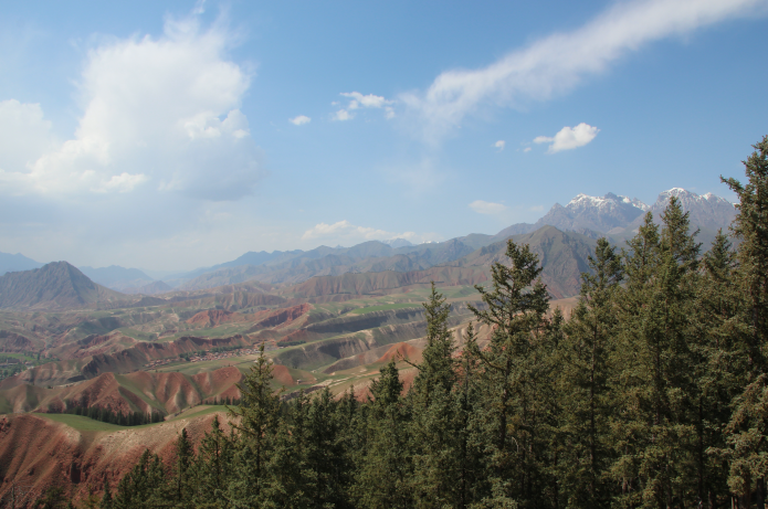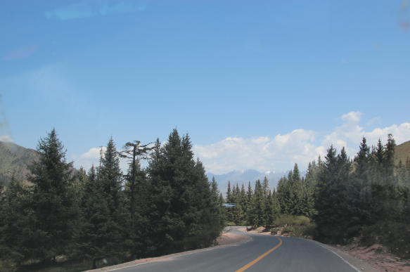 翻过大冬树山垭口 ,就是连续的下坡路,我也记不清拐了多少个弯,可能有好几十公里的下坡路吧!海拔也急速的下降,慢慢的路上的树多了起来,我们进入了祁连 县的冰沟林海景区!