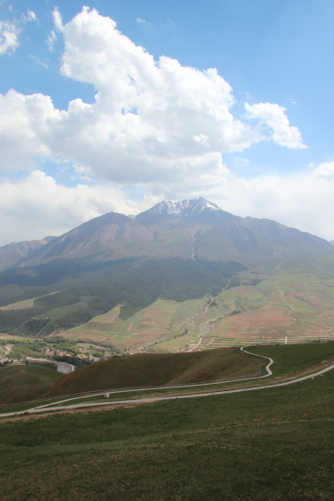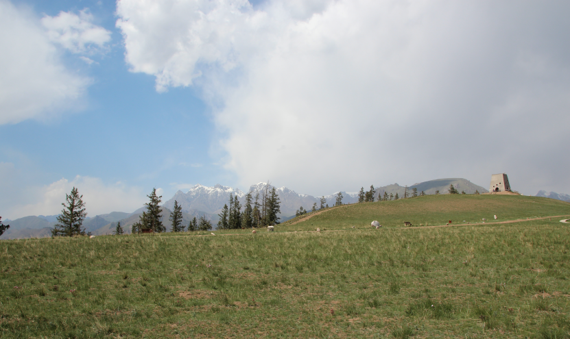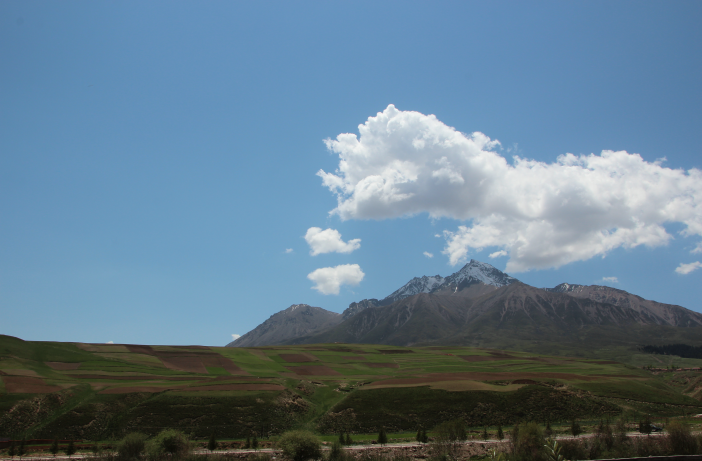 牛心山 是祁连 的标志,藏语称阿咪东索,意为“众山之神”,“镇山之山”,海拔4664米,藏族敬其为北祁连 众山之神。大山顶上终年都有积雪覆盖!慢慢的牛心山 越来越近,祁连 县城也马上快到了!这个县城是一个回族人聚居的地方,回族人也要放牧,但种地的要多一些,所以农田渐渐多了起来。我们来的不是时候,油菜和青稞都才发绿,最美的时候是7月中下旬,满山的油菜花,美的让人目不暇接!一下午牛心山 的山顶上都有一大朵云,就像是天使的光环一样,害我们照出来的牛心山 都有点阴暗!