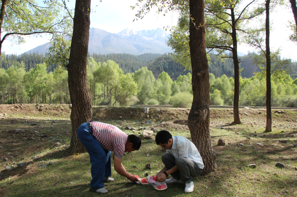 我们找了块地方,面对牛心山 ,在八宝 河畔吃起了西瓜~~~娃哈哈,好爽!