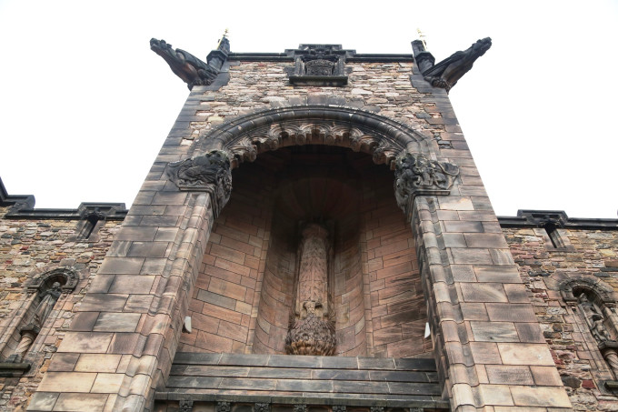 城堡门口的广场名叫“Esplanade”, 是18世纪中人们游行的地方,每年夏季爱丁堡艺术节期间,都要在这里举行盛大的军队仪式表演,就是著名的“Military Tattoo”,吸引着全世界的游客。城堡门口有两个守卫的雕塑,分别是威廉华莱士(William Wall ace ) 和罗伯特(Robert Bruce) ,他们都是维多利亚女王时期苏格兰最伟大的英雄。
