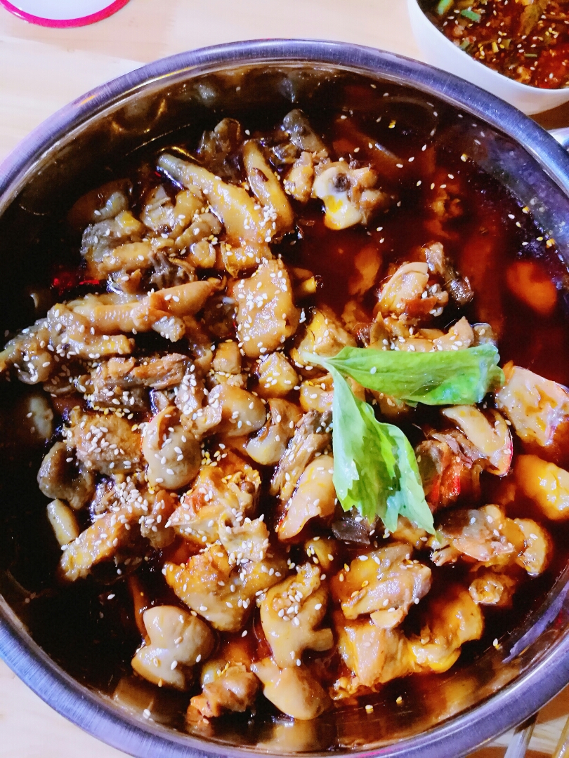晚上回酒店觉着太晚了,就在酒店旁边随便吃的,肥肠鸡。简直发现新大陆,好吃爆了。嗯,两个人,吃完了。