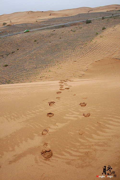 绿色的是我们包的车,这条路是从沙漠中间开出来了,马路两边都是治沙的网格