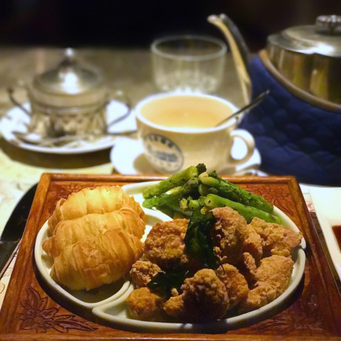 太晚到酒店,晚饭也没吃,逛着发现二楼有吃饭的,果断上楼试一下。他们没有正餐什么的,都是茶点。我点的芦笋,盐酥鸡和萝卜酥。终于完成了要在台湾吃盐酥鸡的夙愿。真的很正宗,他们还给盐酥鸡配了酱。吃下来还是蜂蜜芥末酱(honey mustard)最好吃。饮料点了他们特色的奶茶,是两种茶(貌似是乌龙茶和大吉岭红茶)混在一起配的鲜奶,还有珍珠。非常好喝~