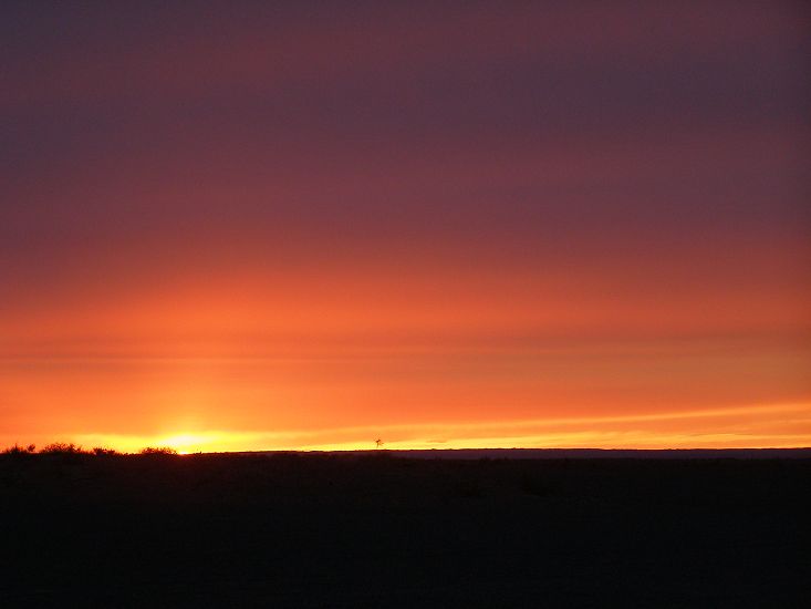 一路上,无边的荒芜让我震撼也心泛酸涩,它荒芜得是那么的广阔、大气、无奈和坚强,真不知在年少时被传授的“祖国地大物博”中它占了多少份量!少许的植被已经枯黄了可依然不屈地迎着风面着沙,看过了你便懂得生命的可贵,其它的,还计较什么?在路上,还遇到一个奇特的现象,同伴中有好几个都看到了前面不远处的湖泊,可无论我们怎么前行,即使到了那儿湖泊依然还是在前方,没有其他只有湖,所以不知算不算海市蜃楼呢?
