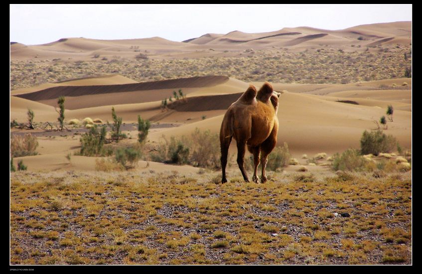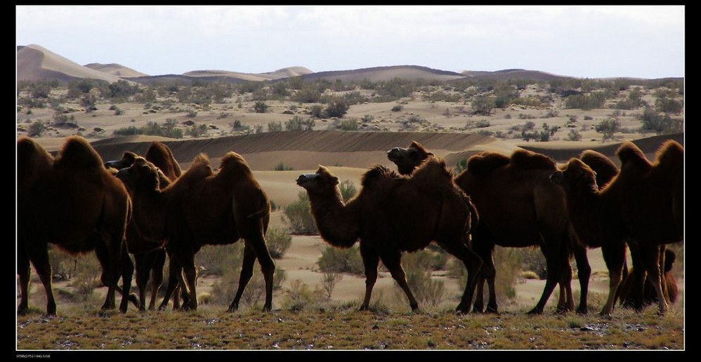 就在我们喋咕的时候一群骆驼突然闯入了眼帘,足有十多匹,它们相依相伴着缓缓而行,不远处,沙丘起伏漫漫,零零星星的植株一路点缀其中,在苍凉中滋生出的希望光景也算是浪漫吧!真想知道哪儿才是它们的归宿。一匹孤独的骆驼背对着我,它仰视着远处层层叠叠的沙丘,一动不动,我看不到它的脸,不知道它有怎样的表情,它是在思索还是在茫然呢?我不希望它茫然,在这样的环境中茫然容易消极、颓废甚至绝望。宝贝,那风沙中飘摇着的绿色是希望,你能看到的,是吗?所以,你不孤独,有家人、同伴的不离不弃就是幸福……