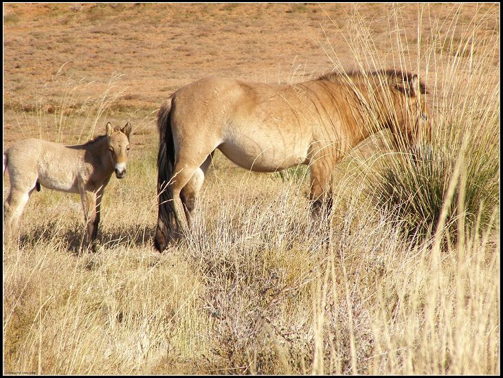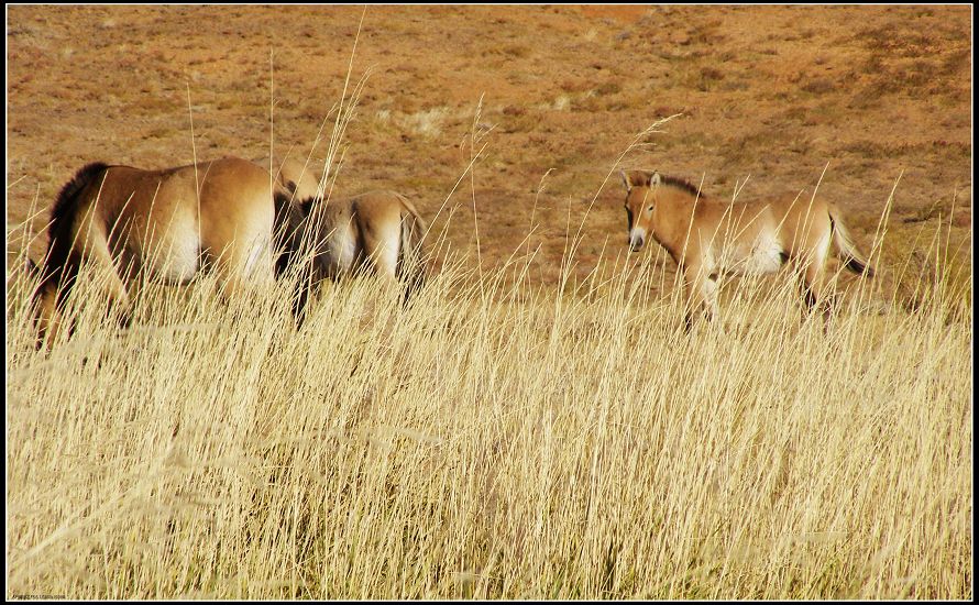 重回“天路”不久,突发现右边约一公里处一人高的芦苇丛中聚集了十几匹野马,我们狂喜,想亲近它们却又怕打扰它们的那份优闲,要知道在这样的沙漠、戈壁中优闲实不易得。司傅告诫说只要别靠太近,没有惊吓,十米远的距离它们是不会跑开的。于是乎,一哄而散、又蜂拥而至。阳光下的沙漠强硬地有些刺眼,一簇簇不知名的花却依旧绽放其中,芦苇肆意轻柔地摇摆着身姿,马儿们自顾自地甩着尾巴低头食草,信步苇中,恍如来到了非洲 大草原。