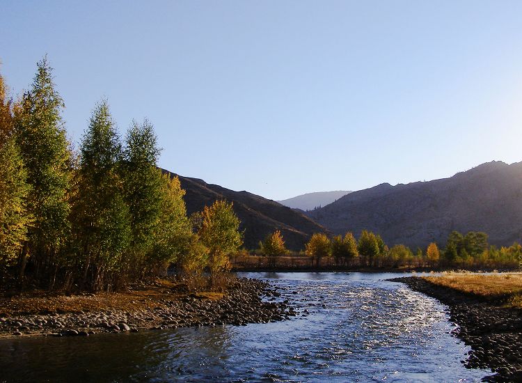 不知不觉中太阳落到了树梢,恰库尔 图大桥的日落陶醉了我们所有人。夕阳斜影,晚霞满天,不知是天印在了水中还是水飘在了天上,如情人般地浑然交融,河堤傍的树也不甘落莫,肉体不能介入便索性将灵魂游离进了河中,潺潺地对望呼应,直至暮色褪去。。。坐在河边,目视此景,顿感心境空灵安详、世间之争索如孩提游戏般。。。。。。
