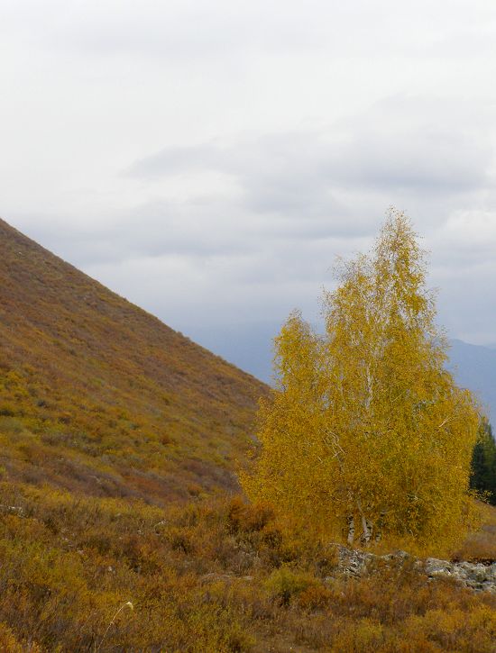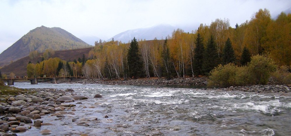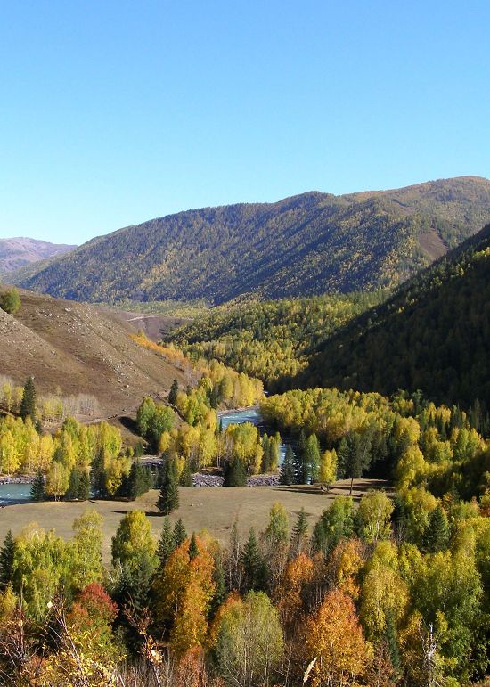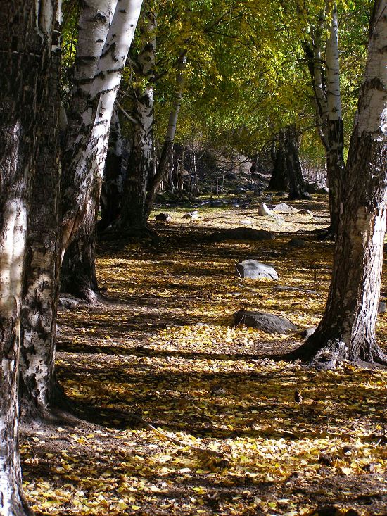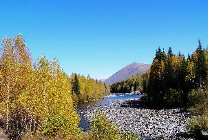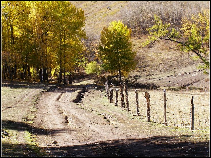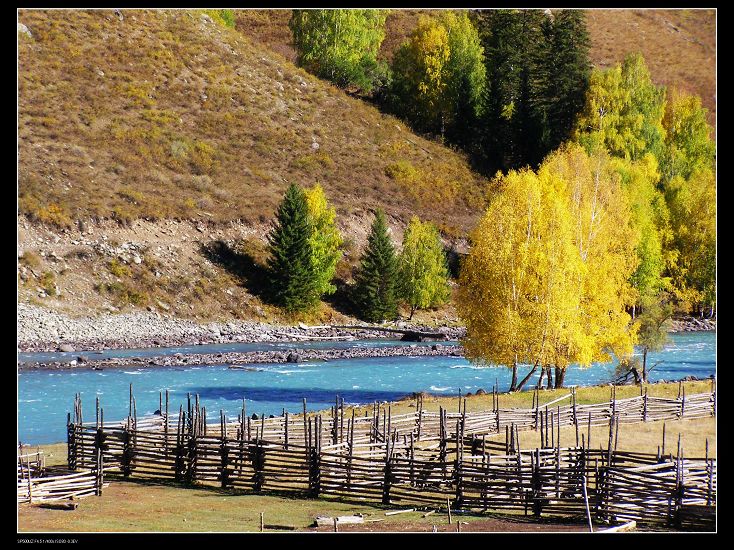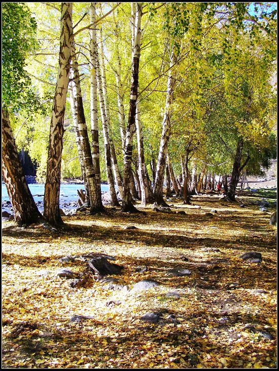 沟内人烟稀少,沿路顺水而行,喀尔齐斯河水流轻缓,碧绿深幽,青褐的卵石或星星点点或扎堆成片地落在河中,河两岸白桦林立,姿态万千,有迫不及待着金黄的、有羞涩着青黄的,也有顽童嬉戏似的半黄半绿着的,只有松杉不解秋日风情完全固守着那分深绿,交错其间,俨然泼墨成一幅山水画,而我们也只是赏客罢了,即使走进画里最多也就是画者从笔尖无意滴下的那几滴墨汁儿,隐隐若无般。但这丝毫没有减弱我们的兴致,在一弯金色白桦蔽护的山路上,我们导演了一出自已的浪漫。山高水清,天蓝云淡,牵手风中,栩栩如生地漫步着,看黄叶片片,飘过发梢,栖在肩上,纷纷扬扬中 一地落英,也落下了喀尔齐斯河边的一声叹息。。。