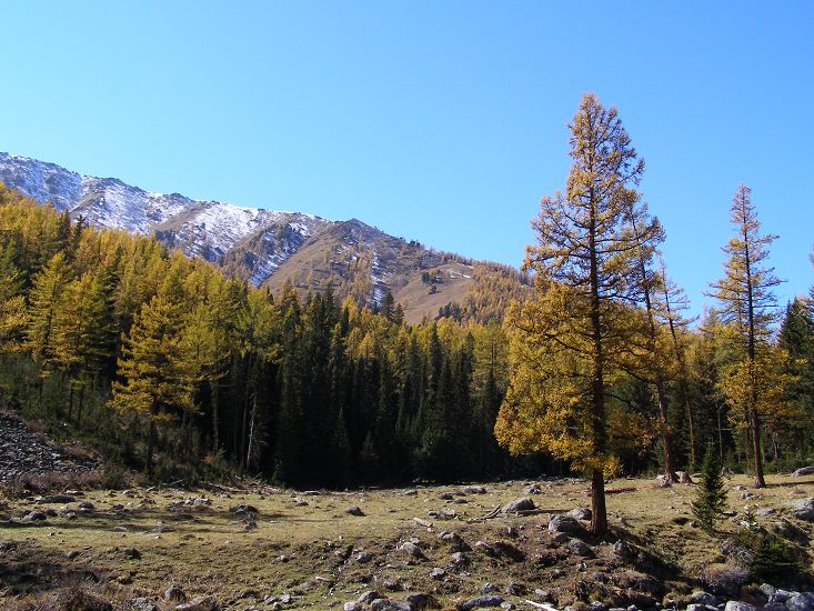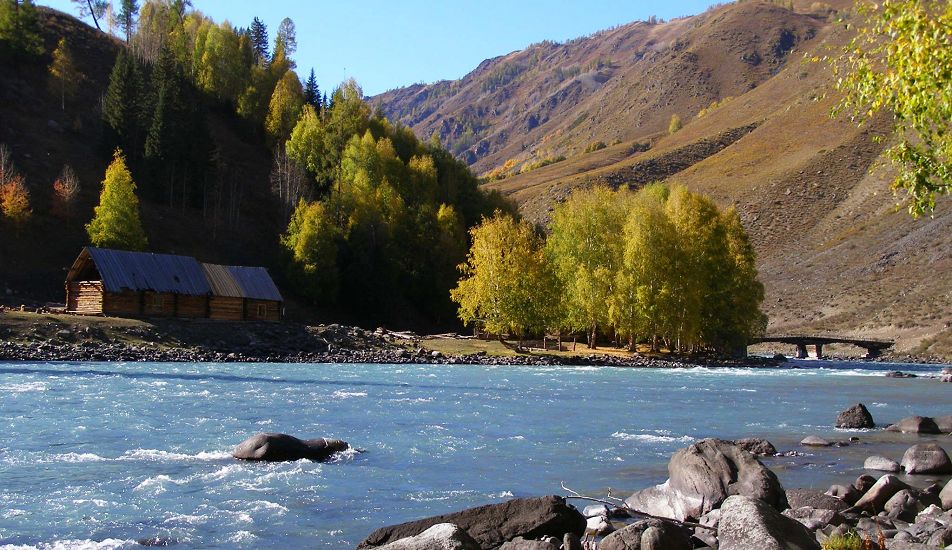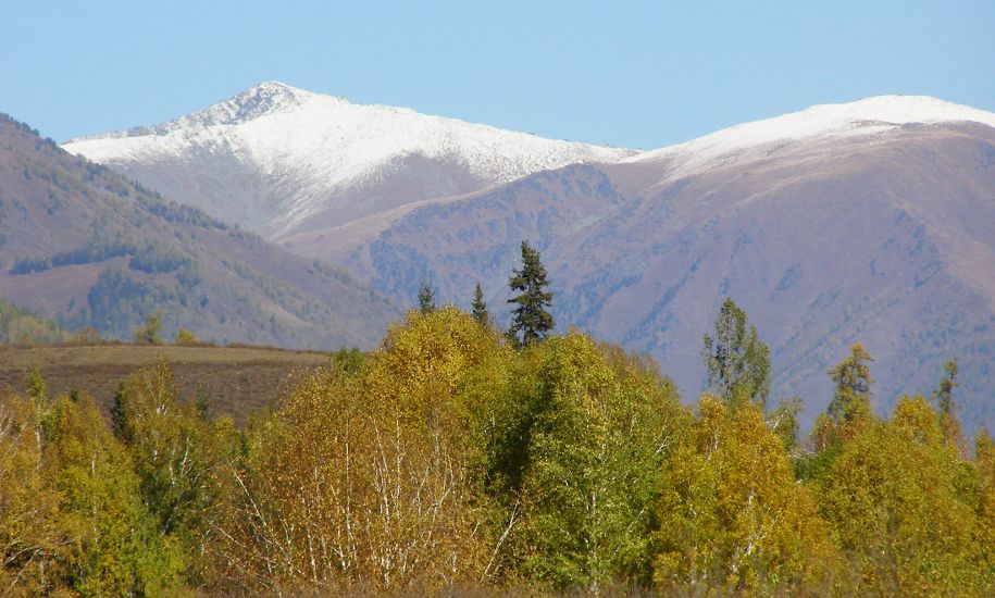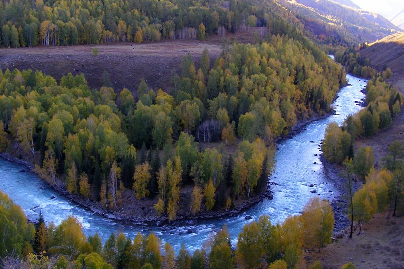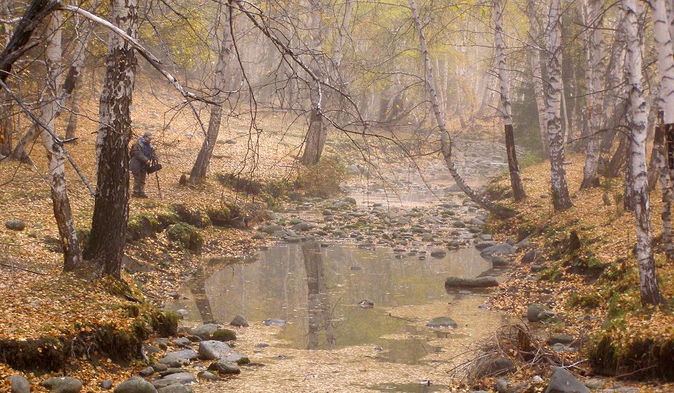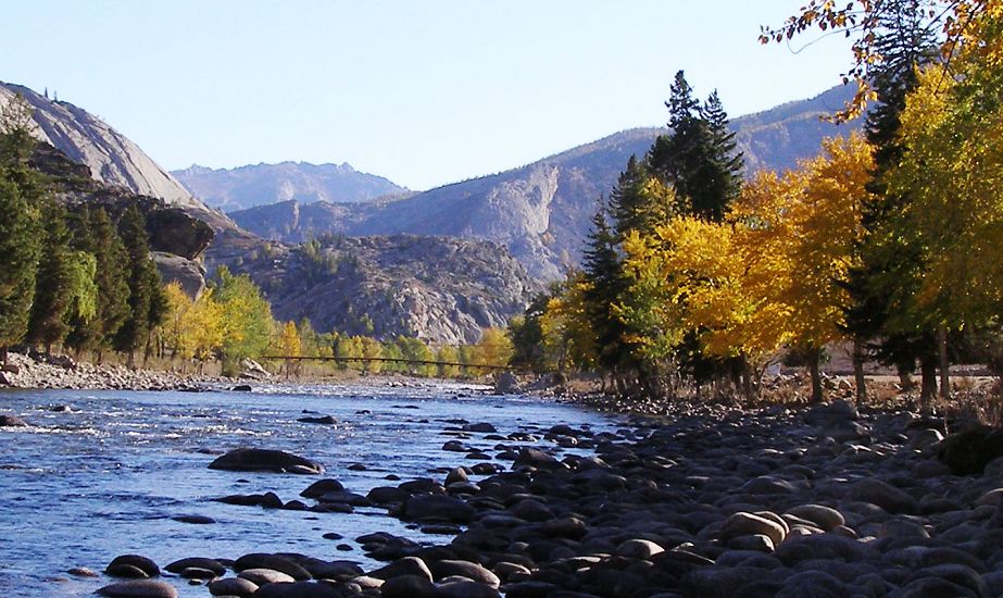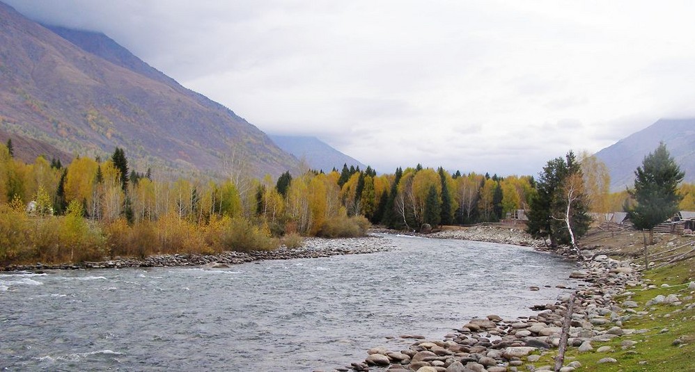 沟内人烟稀少,沿路顺水而行,喀尔齐斯河水流轻缓,碧绿深幽,青褐的卵石或星星点点或扎堆成片地落在河中,河两岸白桦林立,姿态万千,有迫不及待着金黄的、有羞涩着青黄的,也有顽童嬉戏似的半黄半绿着的,只有松杉不解秋日风情完全固守着那分深绿,交错其间,俨然泼墨成一幅山水画,而我们也只是赏客罢了,即使走进画里最多也就是画者从笔尖无意滴下的那几滴墨汁儿,隐隐若无般。但这丝毫没有减弱我们的兴致,在一弯金色白桦蔽护的山路上,我们导演了一出自已的浪漫。山高水清,天蓝云淡,牵手风中,栩栩如生地漫步着,看黄叶片片,飘过发梢,栖在肩上,纷纷扬扬中 一地落英,也落下了喀尔齐斯河边的一声叹息。。。