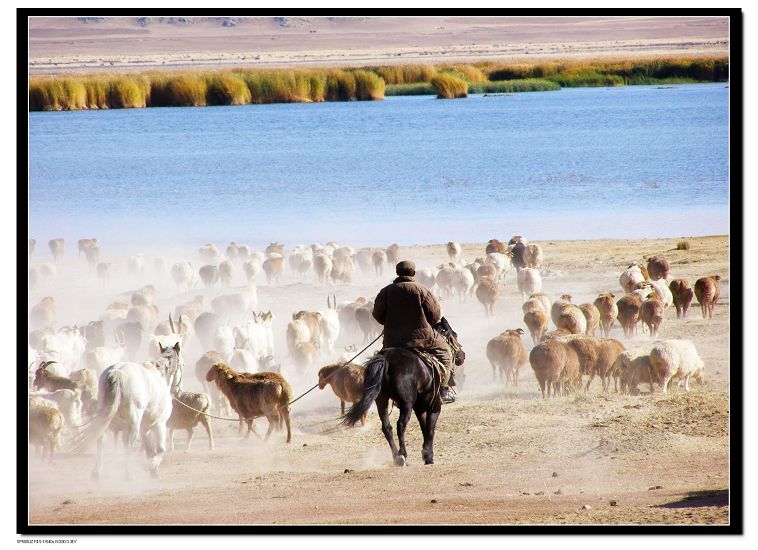 从可可托海出来,心情飞舞,经过一个叫伊雷木特的地方,这也是个村子,黄土构筑成的房屋散落在湖的不远处,黄色的庄稼地和草场错落有致,线条流畅,色调淡雅,详和恬静中又不失大气。突见一群羊急急地簇拥着往湖边跑去,牧羊男子挥鞭策马跟往,蹄踏之处烟尘滚滚,直踏进我心里。我从不掩饰对策马扬鞭、疾路奔跑中的男人的喜欢,甚至是迷恋,我恋的不是这个人,而是他此时迸发出的粗犷、自由、勇敢、奔放、刚毅、还有浪漫的气质。我想这辈子我只能这样小女人了。