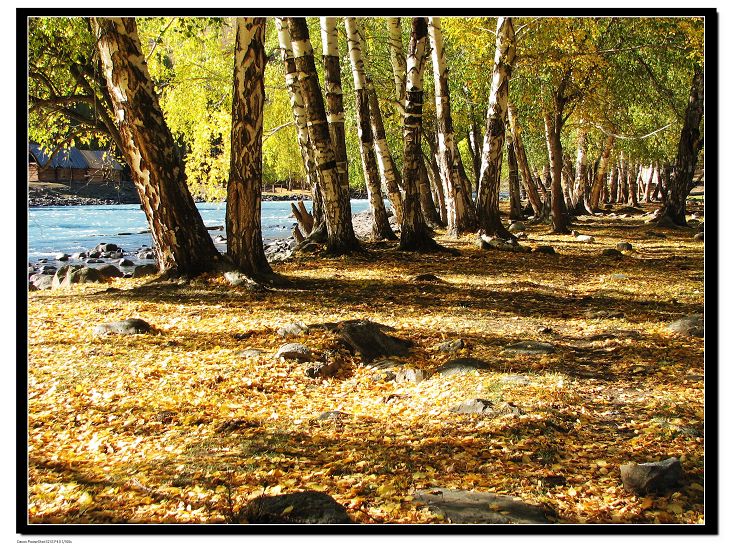 一路愉悦中来到了喀那斯河边,这里是喀那斯湖的下游,河水湛蓝,至上而下看,丰满的S体型极具诱惑力,河上有座木桥,那便是布拉勒汉桥了。河的这边有几树白桦吸引了我,它们优雅地旁若无人般地展出着它们的丰彩,不知道要这样依偎多少日月、沉淀多少风霜才能出落成这般丰韵?过桥的路是通向禾木 的马道,一直顺河婉延向东。河岸边有一片白桦林,依旧是厚厚的落叶铺满地,但上面却零星地点缀着一、两块儿石头,这柔的叶儿硬的石儿衬在一块儿突然让我觉得它生动了许多,于是,一个念想闪出,我抬起了头,仰望到了属于自已一个人的幸福。