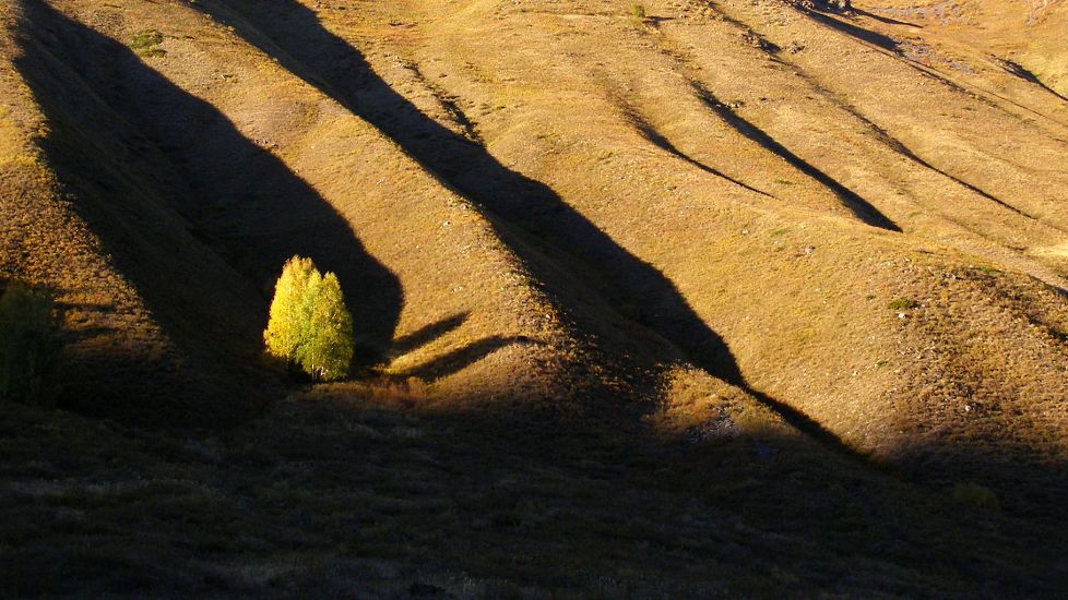 正午的阳光很强烈,照在人的脸上生疼,还未热身便要先翻一个达坂,不觉有些腿软。一个达坂两重天,达坂前的光景简洁,后面的就华丽得让人目眩了。这是一个名副其实的“黄金大道”,路两旁全是金灿灿的白桦树,密密实实、高耸挺拔、阳光在叶儿上顽皮地蹦跳出一树的炫烁,还透过树隙影射出一地的妖娆,落叶层层叠叠洒满了浪漫,捡一片两片于手中玩乐、抛三把四把于空中嬉戏、放五叶六叶于袋中惜藏,都是性情之举。我想,此时此地,即使相爱的两个人不动作,不言语,只一起抬头仰望灿烂背后的那片共同的蓝天白云,便已是幸福了,阳光下眩晕着的幸福啊。。。