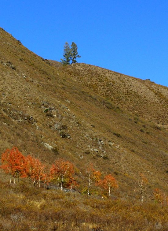 脚下的路非常的平坦开阔,一路上杂草丛生,除了在风中飘扬的一片片毛尾让我感觉到了生命之外,一切毫无生机也鲜有什么绚色养眼,更是连我们以外的一个人影儿也没有,真真是来徒步了。疑惑之时,走到山边探出头去,这才发现我们此时是行走在山坡上的,而昨晚我们3人走的路却在山坡下,与河水的垂直高度大约二十米,低头可俯瞰喀那斯河的灿烂秋色,抬头可仰视山脊梁间的一弯弯火树妖绕,绝不似现在这般干瘪枯燥。想必那3个同伴昨夜走的也是同一路吧!