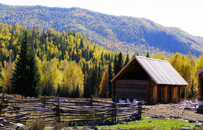 沿着河走,两岸常绿松、落叶松、白桦树生长茂密,色彩丰富,加上水的灵气,绝美之至,让人舒畅!老远就看到前面牧民包有人向我招手,快步跑去,原来是一马帮男子在招呼我,他要请我喝他嫂子做的酸奶。这是个长得很男人的男人,三十六、七的样子,有着西部牛仔似的轮廓和气质,一举手投足间都充满了自由不羁,象极了《勇敢的心》中的男主角。他说他与他哥嫂还有他侄子住在一起,只在这个季节才住在这儿跑跑马,平时是住在山下的。他嫂子不会汉话,跟他们嘀咕了几句后大家都看着我,我不明究里有些尴尬,他告诉我,他们说我长得好看,漂亮!我笑着说谢谢,说喜欢他嫂子做的酸奶。这不是在客套,我是真觉得那奶好喝。别过他们,继续行走在金色画卷中。。。