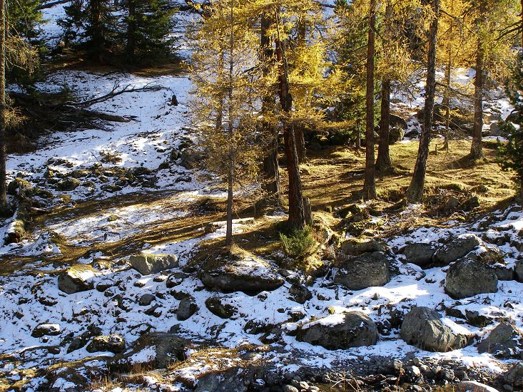 山越行越高路越走越远,不时有积雪绽放路面,雪莲般晶莹纯透,咀一口,冰彻入心,舒畅不已。天上物可以这般洁净,但世间人就远不如了,平坦的山顶上到处是废弃的食用垃圾,“五彩缤纷”地点缀在金黄色的松杉中;20块1壶的开水在途中所谓的第一补给点阴晦地被售卖,呵,不知它身后仅5米开外的那条河水洞晓如斯后会不会沸腾起来呢?原来再洁净的空间也漂白不了人心,那是世上驻长着最多顽渍的地方。