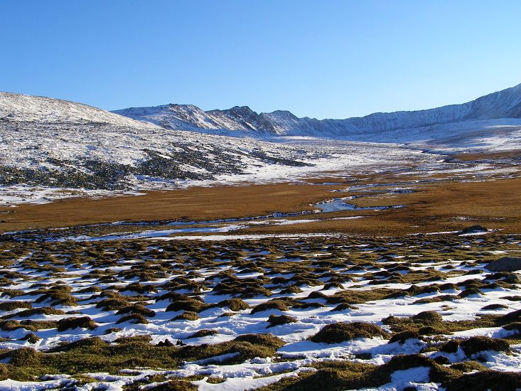 人眼,真是最好的广角镜头。山谷中的景色美极了,一边是白雪皑皑针叶茂密的山林,一边是荒芜苍凉枯草寂廖的山谷,放眼前方,瓦蓝瓦蓝的天空、远山与盆地,那种宽阔只有在高原可见。山的颜色,因为受光度的不同,分黑、灰、青、蓝、绿多种。云遮阳,在坡上覆以大片阴影,偶尔,一米阳光透出来,洒下几道神秘。