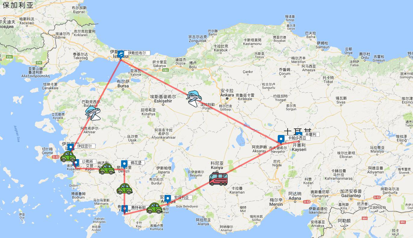 伊斯坦布尔→开塞利→卡帕多奇亚→安塔利亚→费特希耶→棉花堡→伊兹密尔→伊斯坦布尔