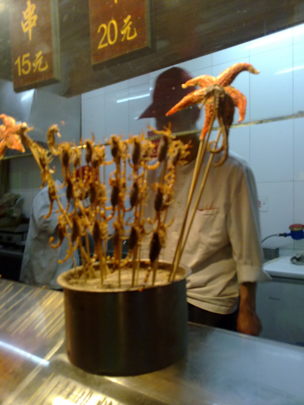 蝎子?海星?我着实疑惑他们是活的吗?到底什么味道呢?好在如此有好奇心的我居然一点不想尝试。很多老外围着,还起哄着围观同伴吃,吃者大有视死如归的气魄。