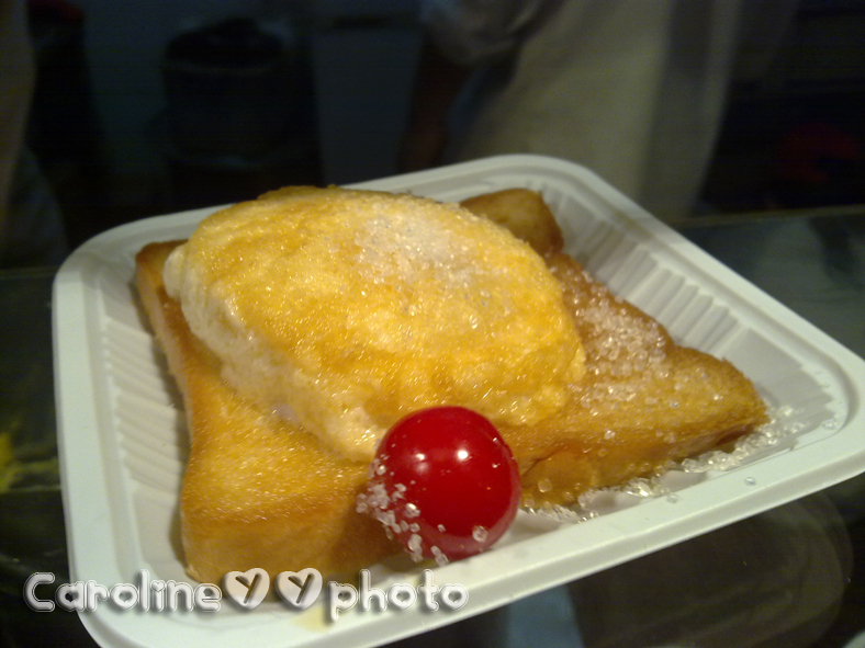 油炸冰欺凌。我不得不说卖相很会骗人啊,底下是吐司,上面用蛋液(我忘了,反正什么东西)裹着一小团冰欺凌,油乎乎的,很恶心,很腻,10元哦,不值。