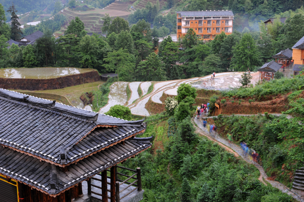 6月6日下午离开平安梯田,去金坑梯田。先要下山回到游客中心,再往金坑梯田大寨村方向去,行车一小时,到达大寨村停车场。私家车就只能停这儿了。