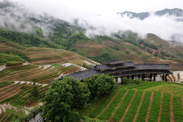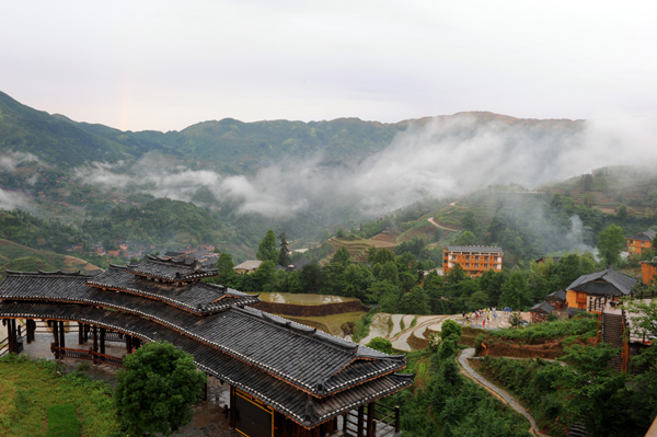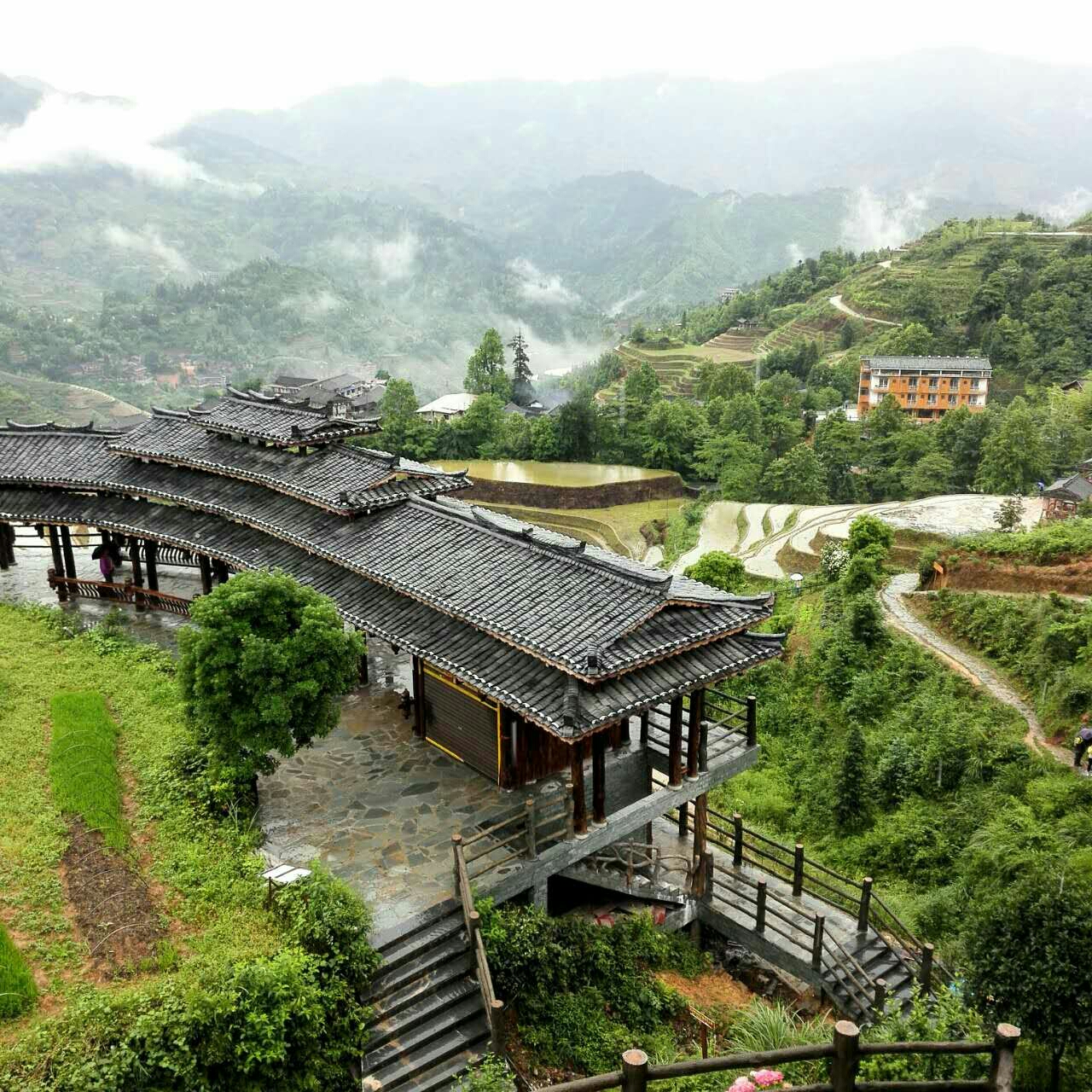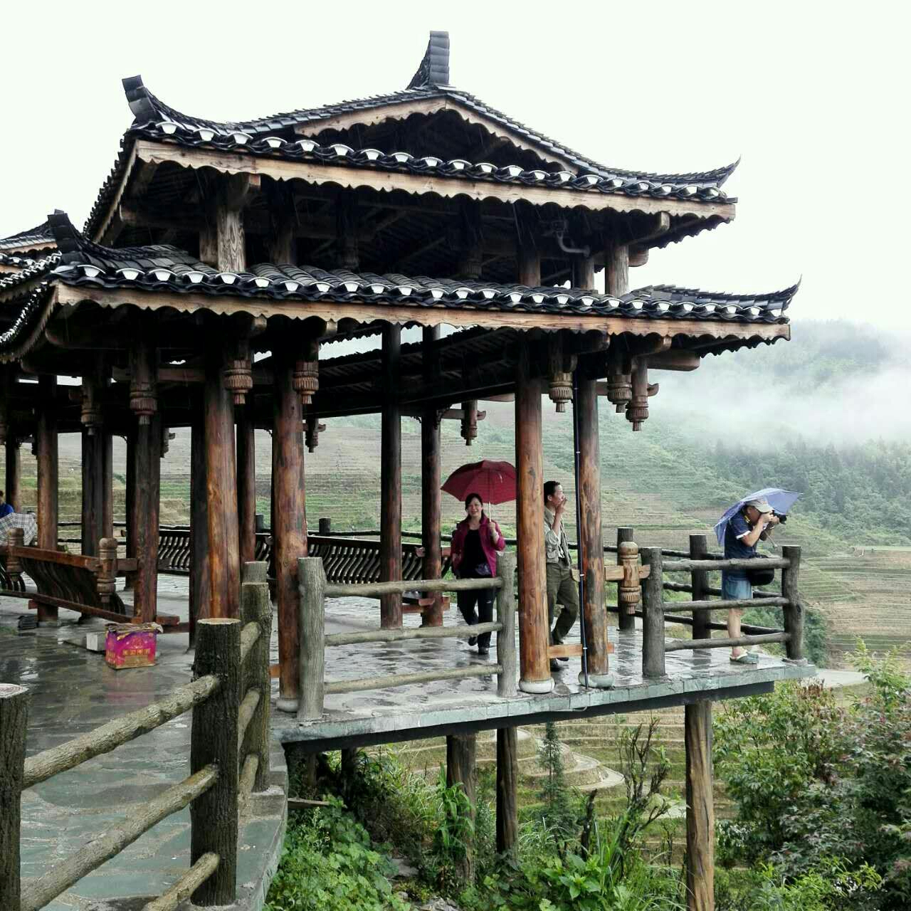 金坑梯田在群山环抱中,景点比较分散,需要步行很长时间。山顶的田头寨村与金佛顶观景台对望,步行却要两个多小时。乡里修的观景台好气派。