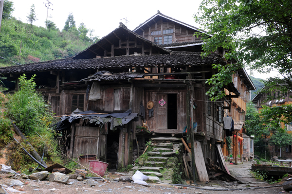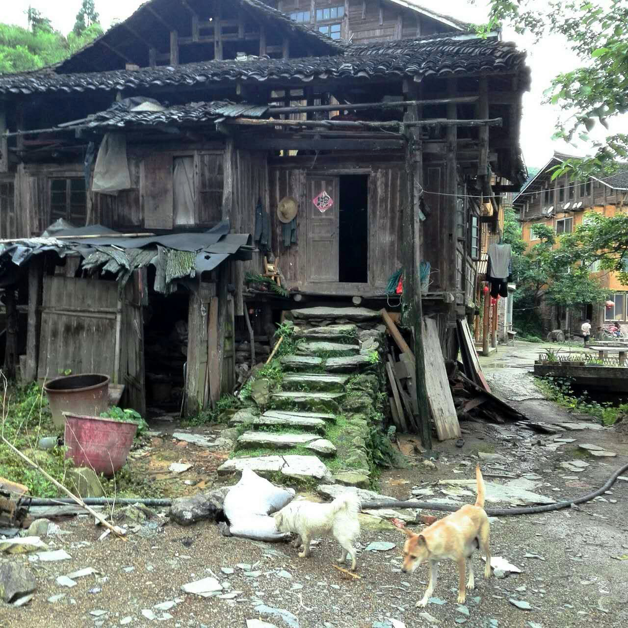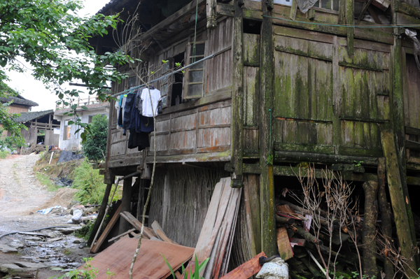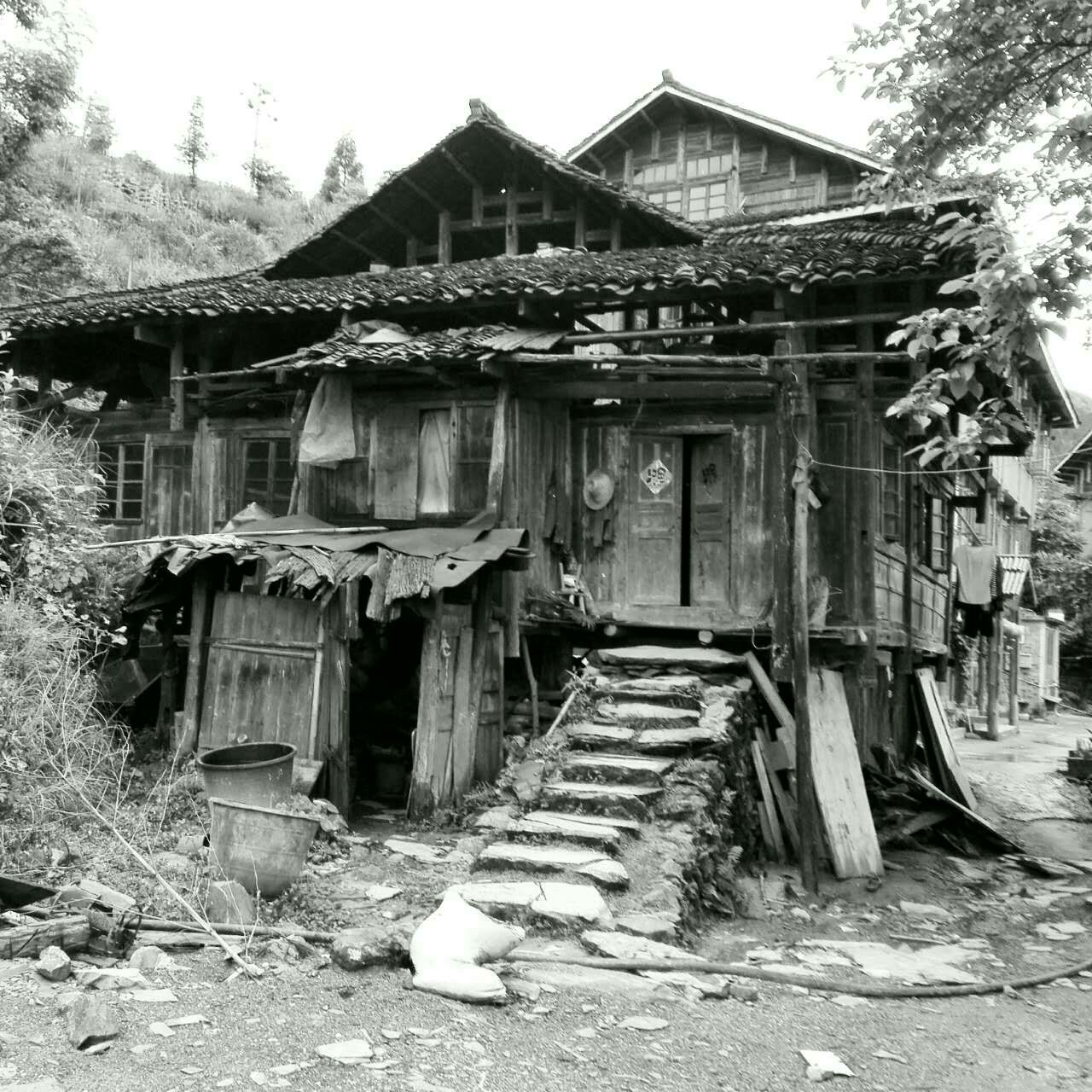 居住在这大山里的瑶族人家,多采用“人”字形棚居建筑,木结构,顶上覆瓦,他们叫“叉叉房”。上面住人,下面养牲畜,也堆杂物。因为,雨水大,房子的外边都有青苔,木板容易被朽蚀。