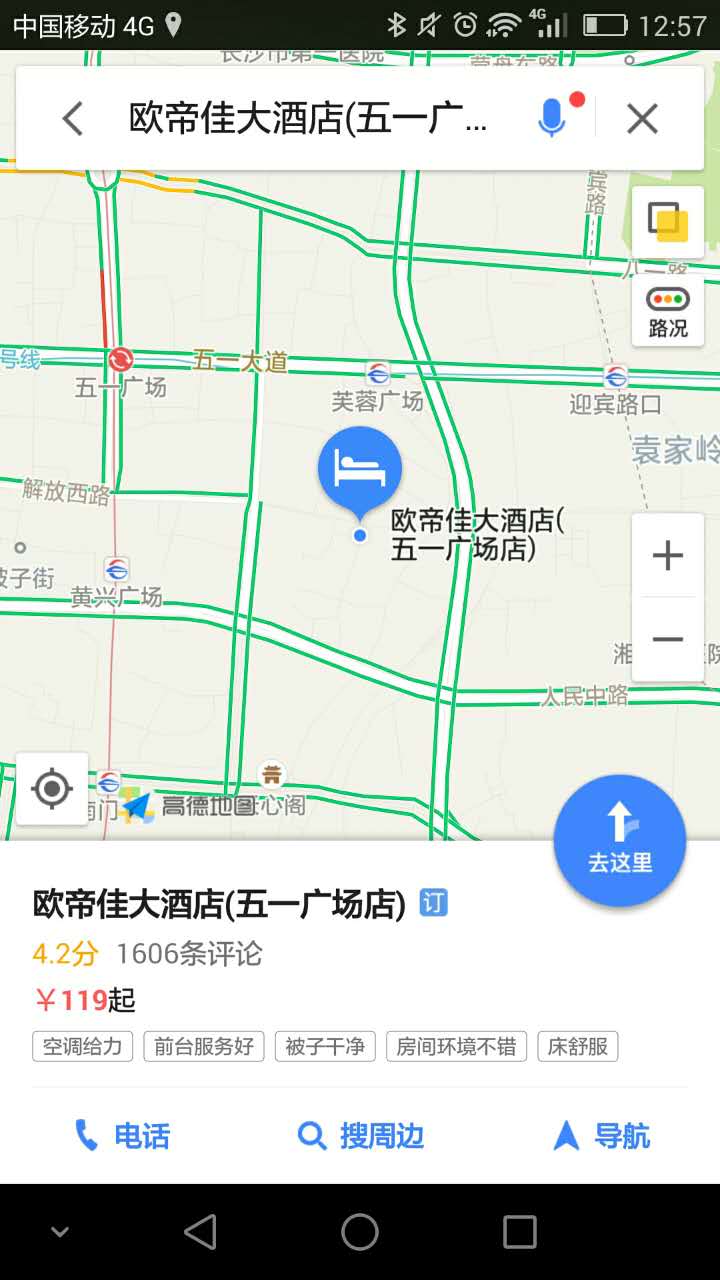 我在艺龙APP,将酒店地址圈定在五一广场商圈,价格150-200,可以提供一次性洗漱用品、无需另付电费,最后选择了欧帝佳酒店标准单人间,4天共计564.2元。酒店位置:芙蓉区解放西路35号(省人民医院附近)