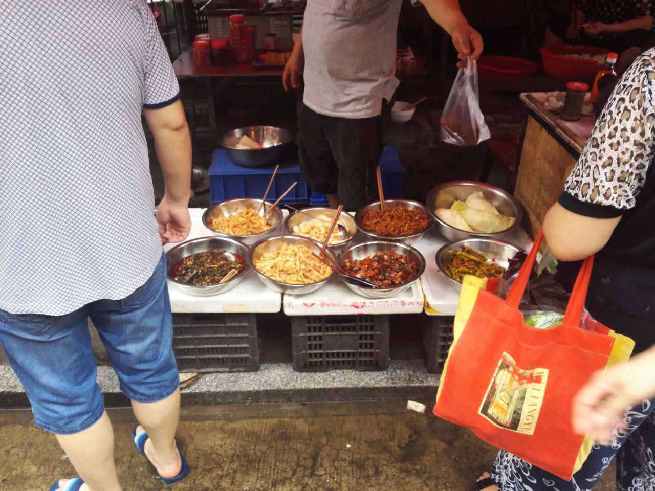 早早起来,再去东庆街,在吴家粉店吃了辣椒肉米粉(9元),你可以自己加酸豆角、外婆菜等其他小菜,很多熟客都会点他家的剁椒蒸排骨粉。