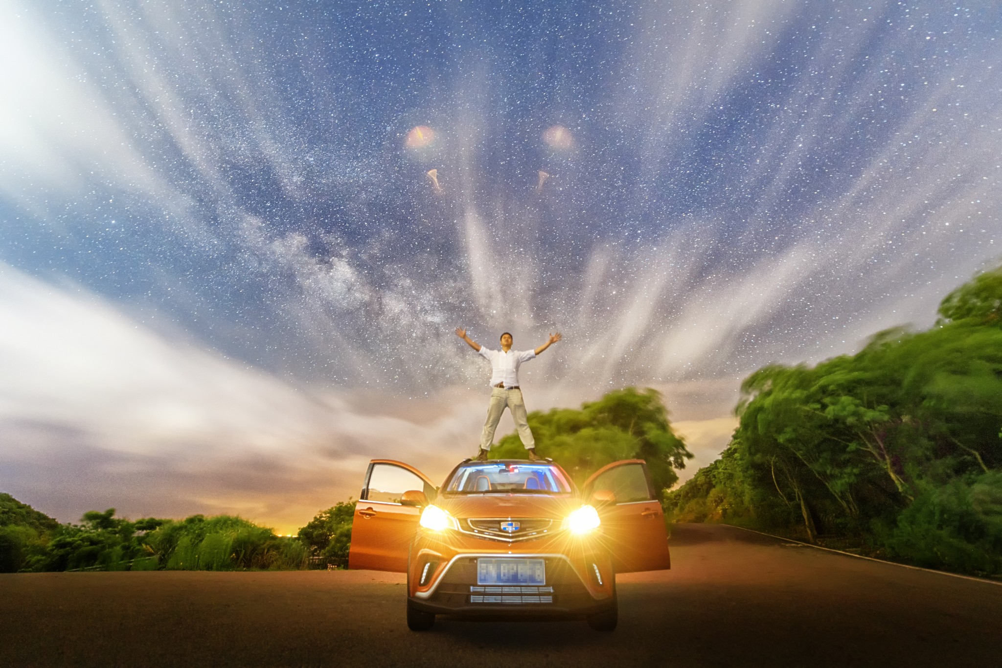 找一处避光的转角进行拍摄,因为拍摄时间和地点银河位置比较高,索性爬上车顶,此时银河忽然变得触手可及,豪气十足。晚上气温比较低,耐不住躲进车里,通过全景天幕看看满天繁星也是不错。