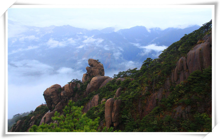 ,虽然没有赶上日出的好天气,但是我们还是很有福气滴!走到景区中部涵星池时天突然放晴了,立刻感觉到无比的兴奋,天清、云清、山清的美妙景色凸现出来,远处的雾虚无缥缈,山峦格外清晰,心情无比的激动,我用相机迅速记录着这美妙的景色,