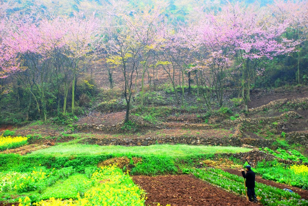 音寨家家户户都在自己的房前屋后山坡上种植李树,每至春分,从音寨极目四望,远山近峦,到处绽开雪白纯洁的李花,这就是远近闻名的盘江酥李之花,恰与音寨河两岸满田满坝盛开的金黄色油菜花形成鲜明对比,白色、黄色交相辉映,粉红色的桃花点缀其间,翠绿色的树丛衬托其底,布依山寨隐约其中,绚烂的色彩,旖旎的景致,华丽的气质,万亩油菜花和千顷李花构织成了“金海雪山 ”之奇景。