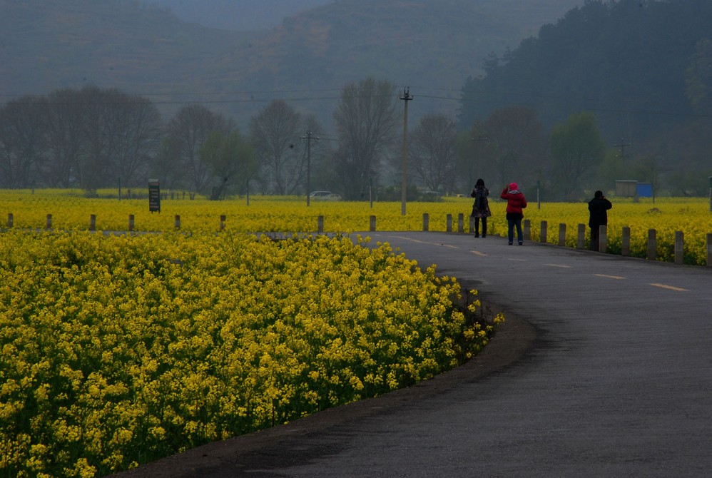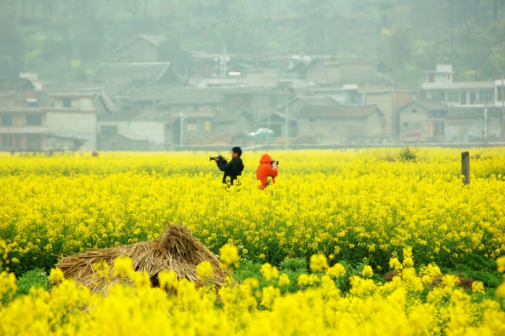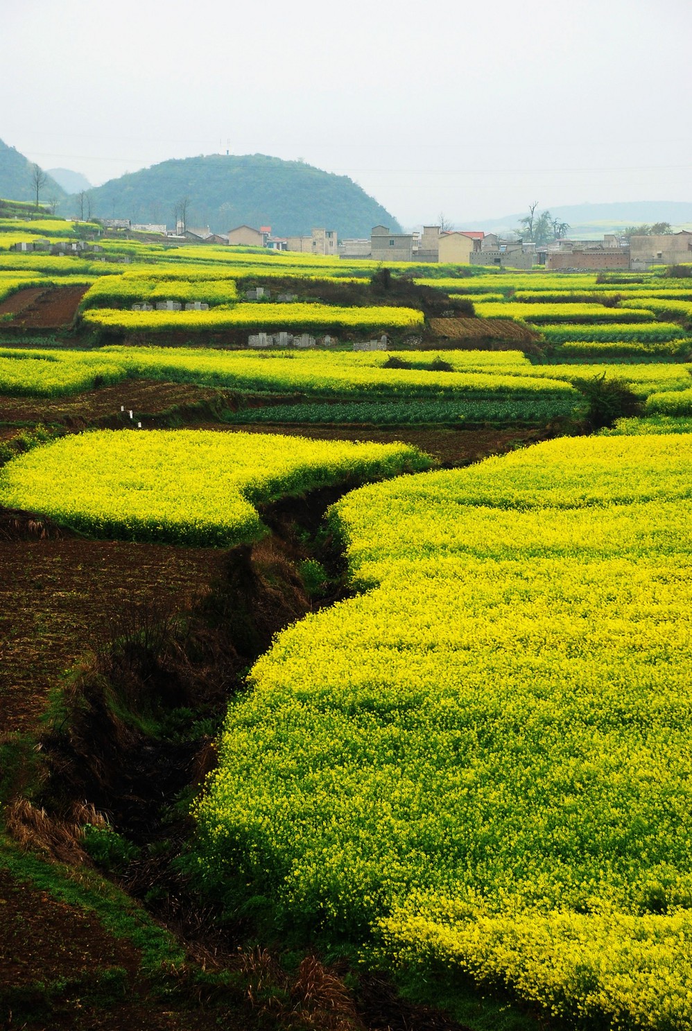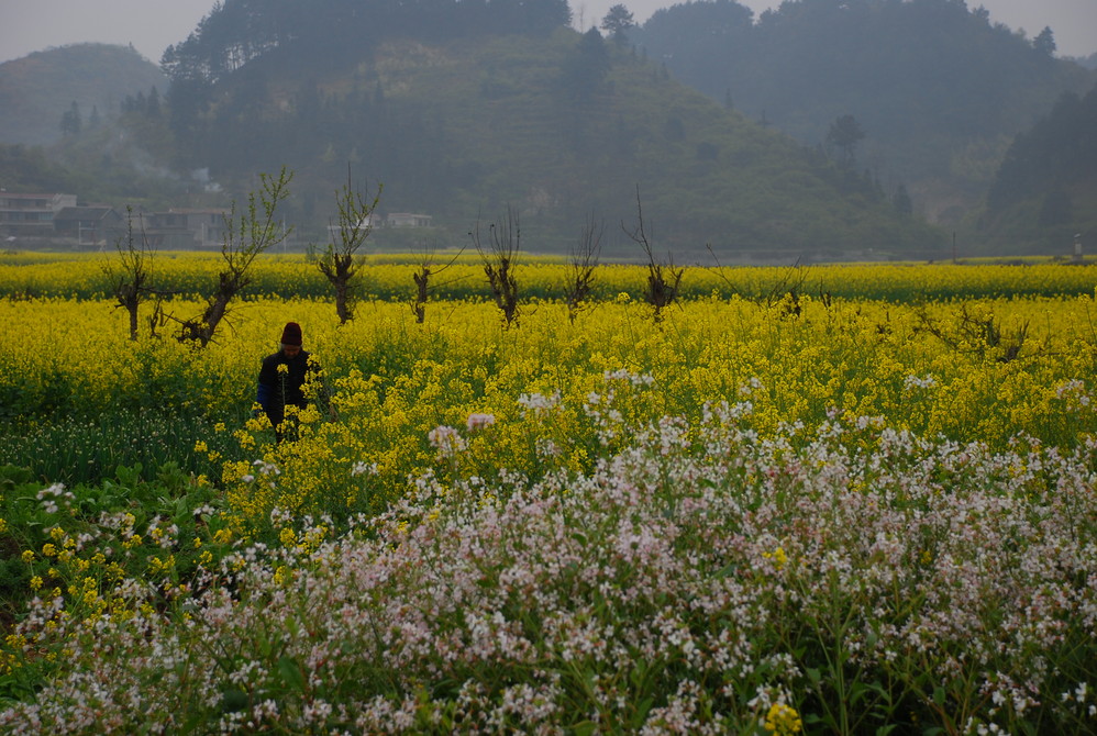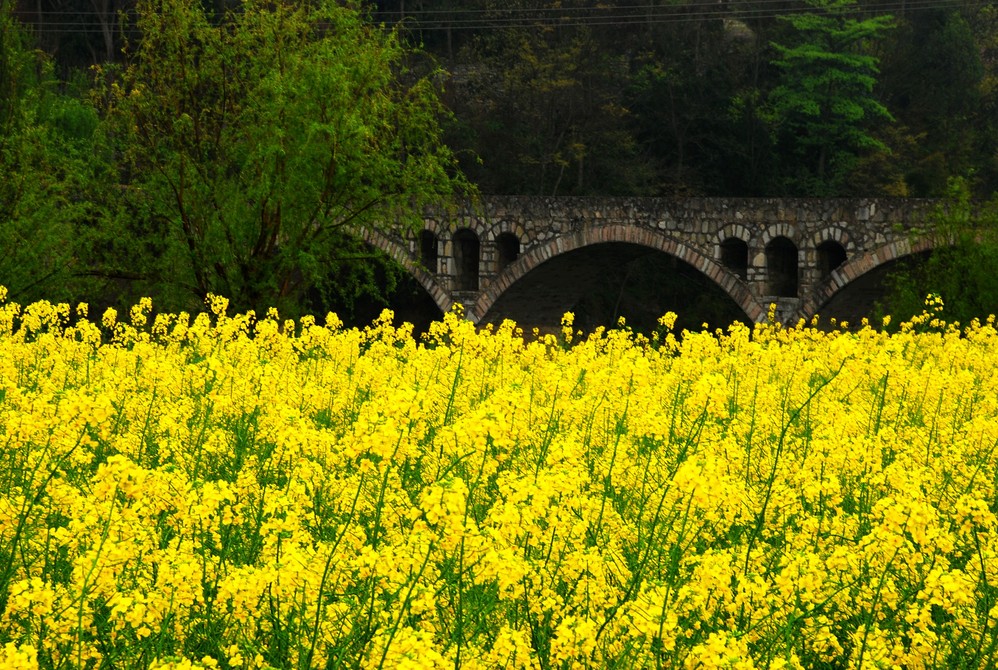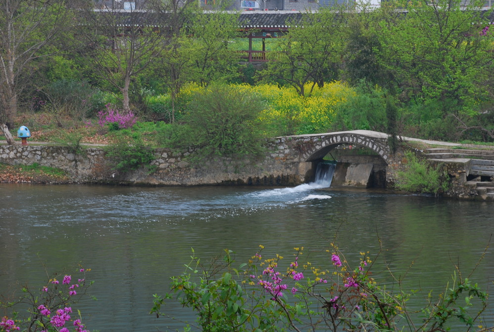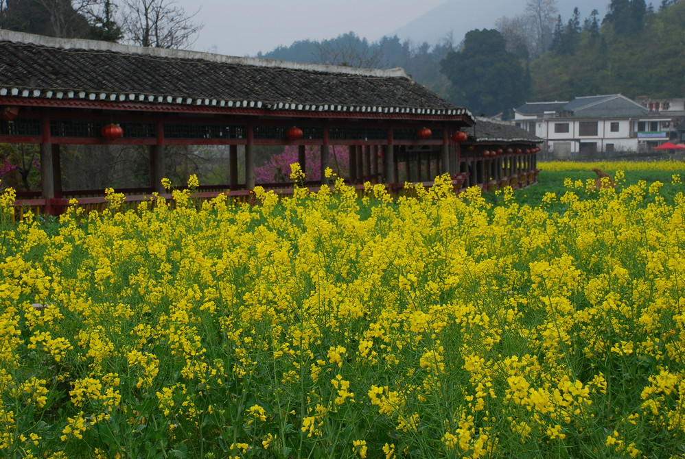 所谓金海雪山 是指山上长雪白的李花田野遍地是金灿灿的油菜花。可能来晚了,只余金海秃山了。不过光是寨前连绵的油菜地也让我们不虚此行。流经音寨的瓮城河河面宽阔,水流舒缓,碧波澄澈,古桥、流水、回廊与盛开的金黄色油菜花相映成趣,构成一幅幅田园风光,野趣横生。