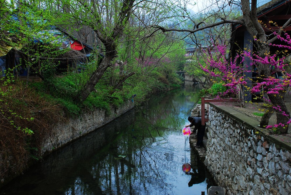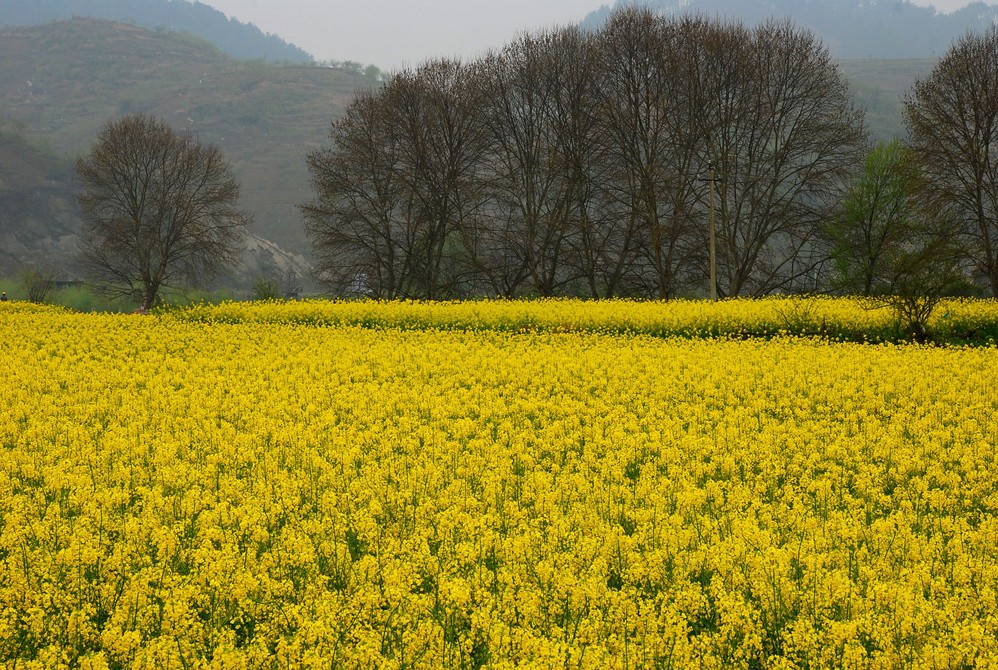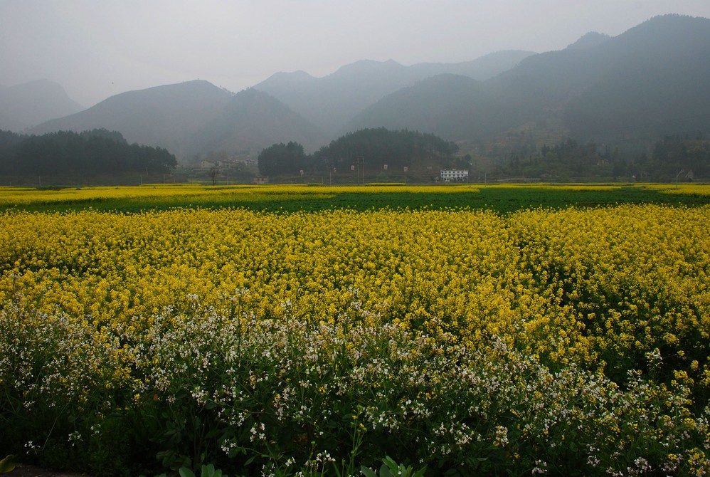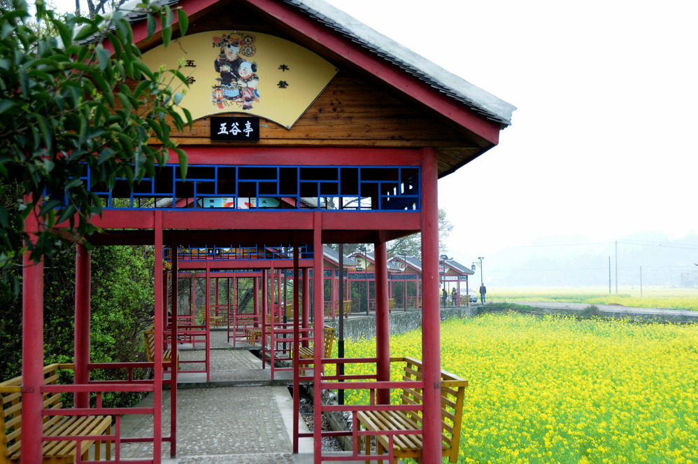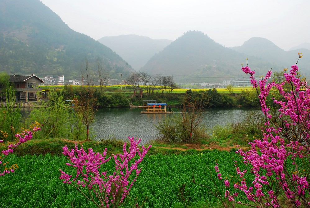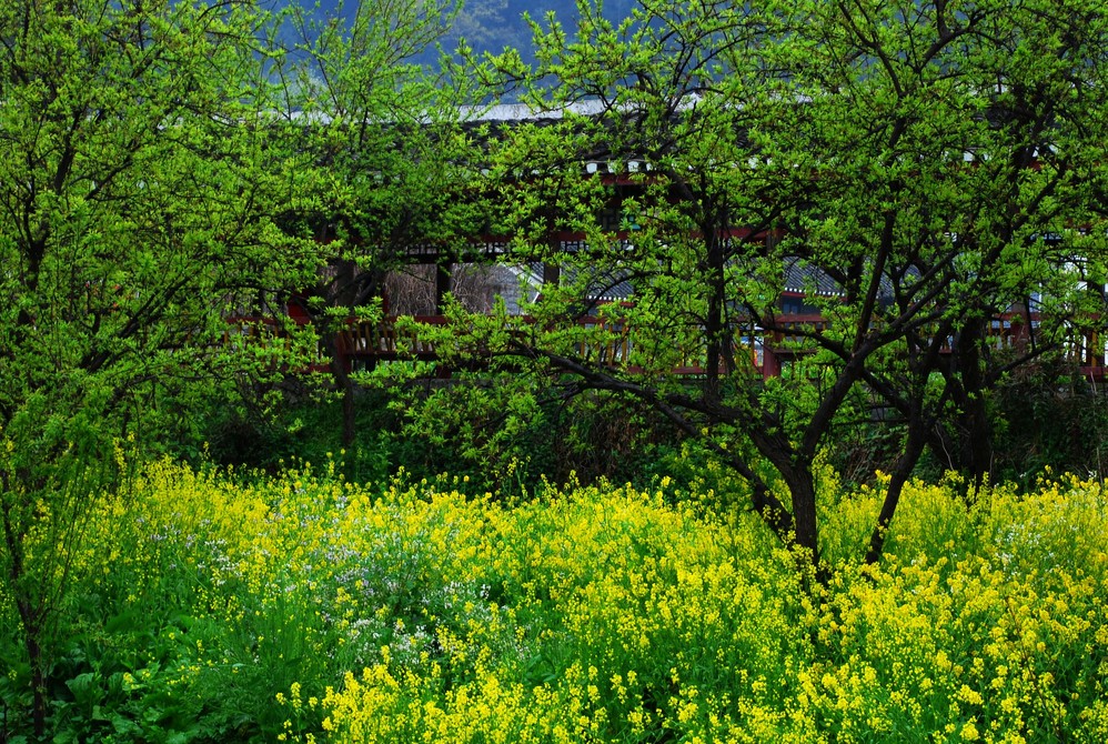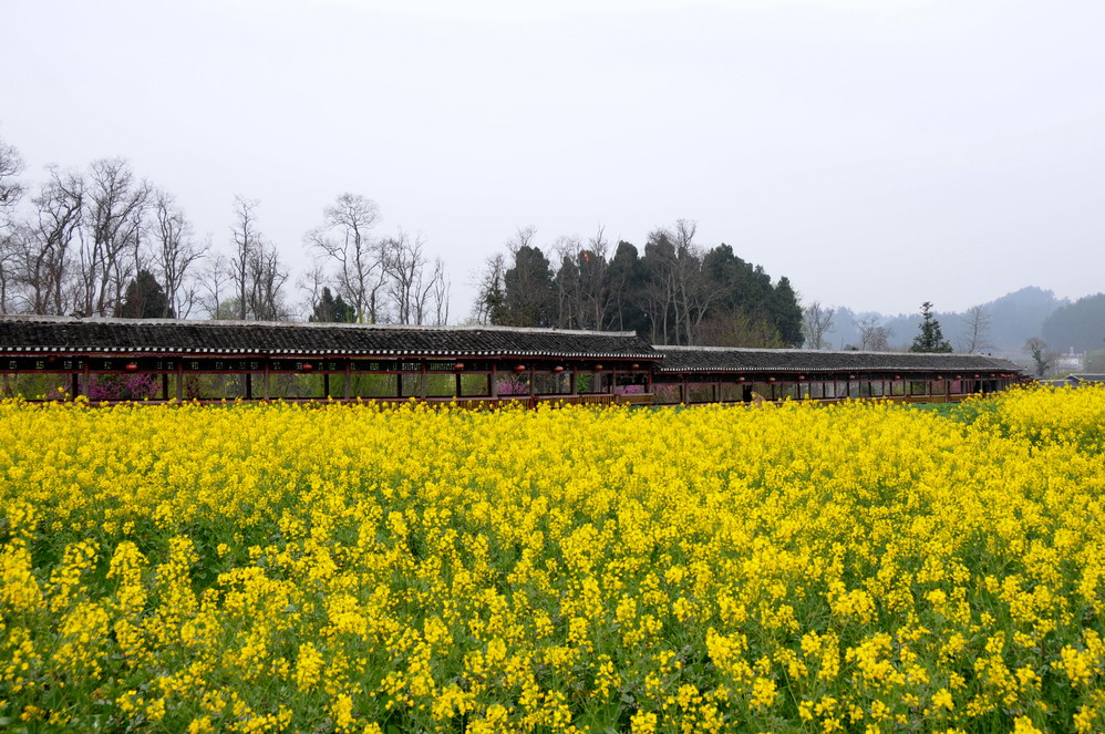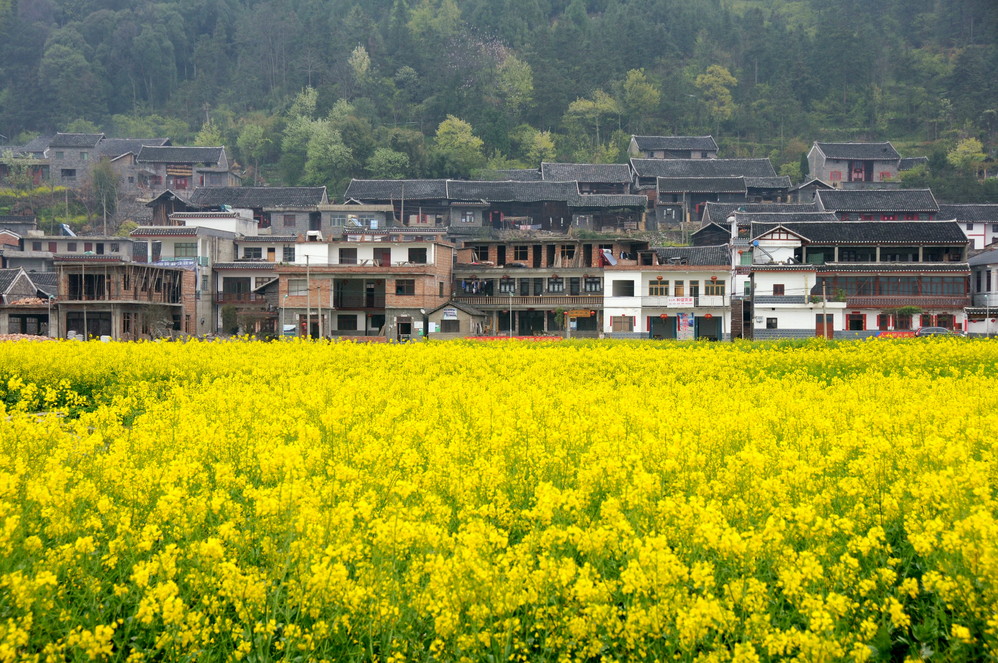 所谓金海雪山 是指山上长雪白的李花田野遍地是金灿灿的油菜花。可能来晚了,只余金海秃山了。不过光是寨前连绵的油菜地也让我们不虚此行。流经音寨的瓮城河河面宽阔,水流舒缓,碧波澄澈,古桥、流水、回廊与盛开的金黄色油菜花相映成趣,构成一幅幅田园风光,野趣横生。