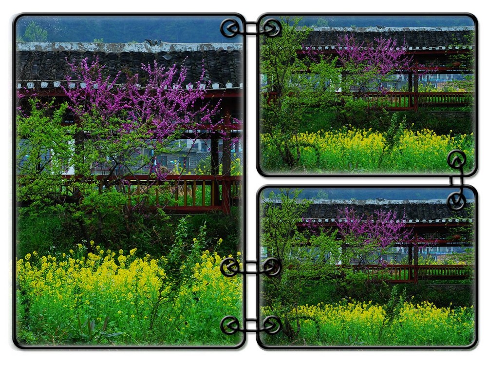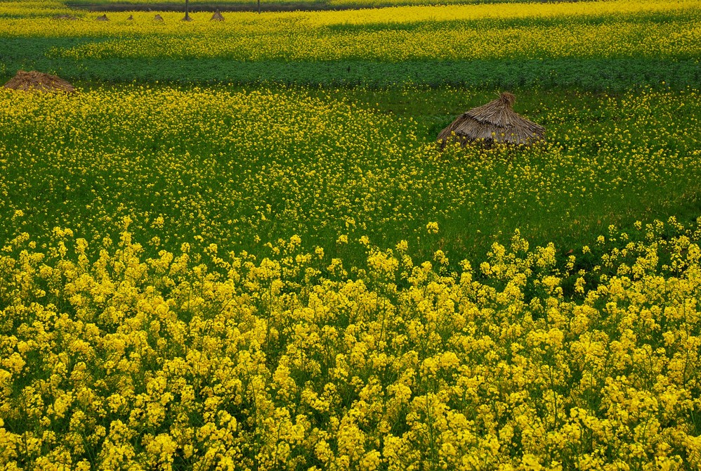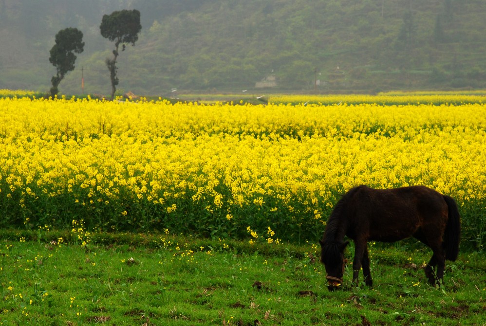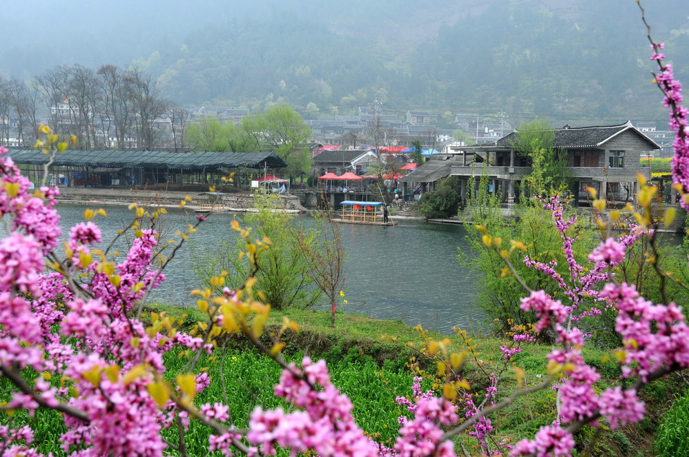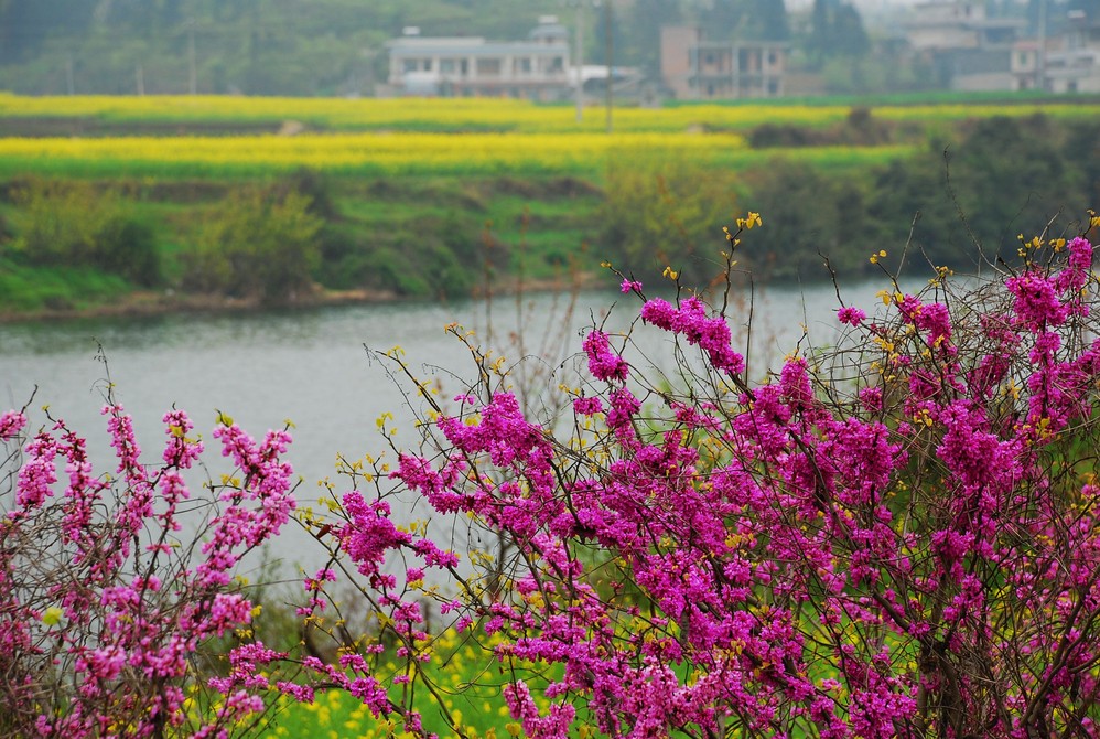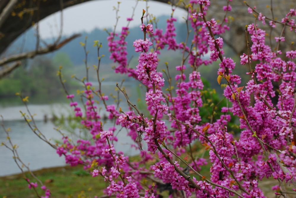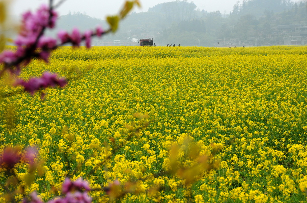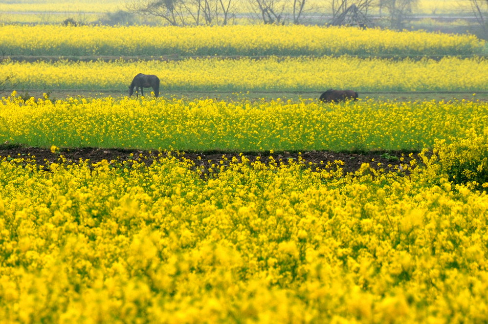 所谓金海雪山 是指山上长雪白的李花田野遍地是金灿灿的油菜花。可能来晚了,只余金海秃山了。不过光是寨前连绵的油菜地也让我们不虚此行。流经音寨的瓮城河河面宽阔,水流舒缓,碧波澄澈,古桥、流水、回廊与盛开的金黄色油菜花相映成趣,构成一幅幅田园风光,野趣横生。