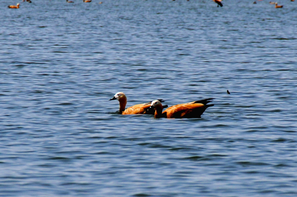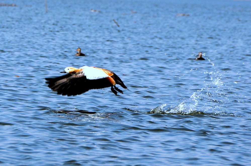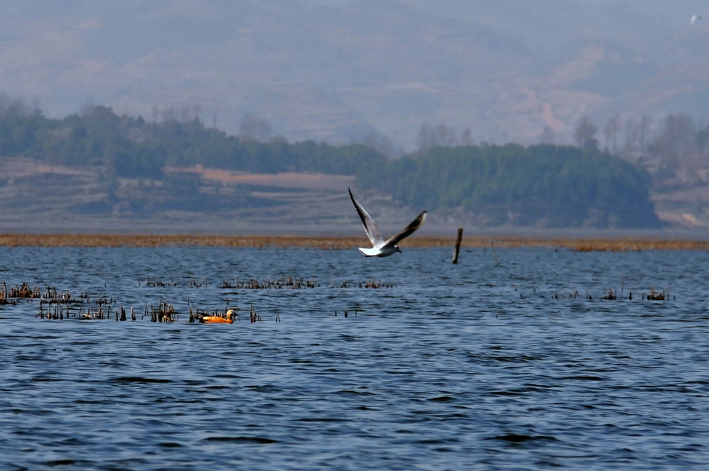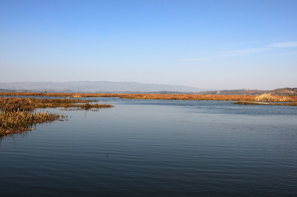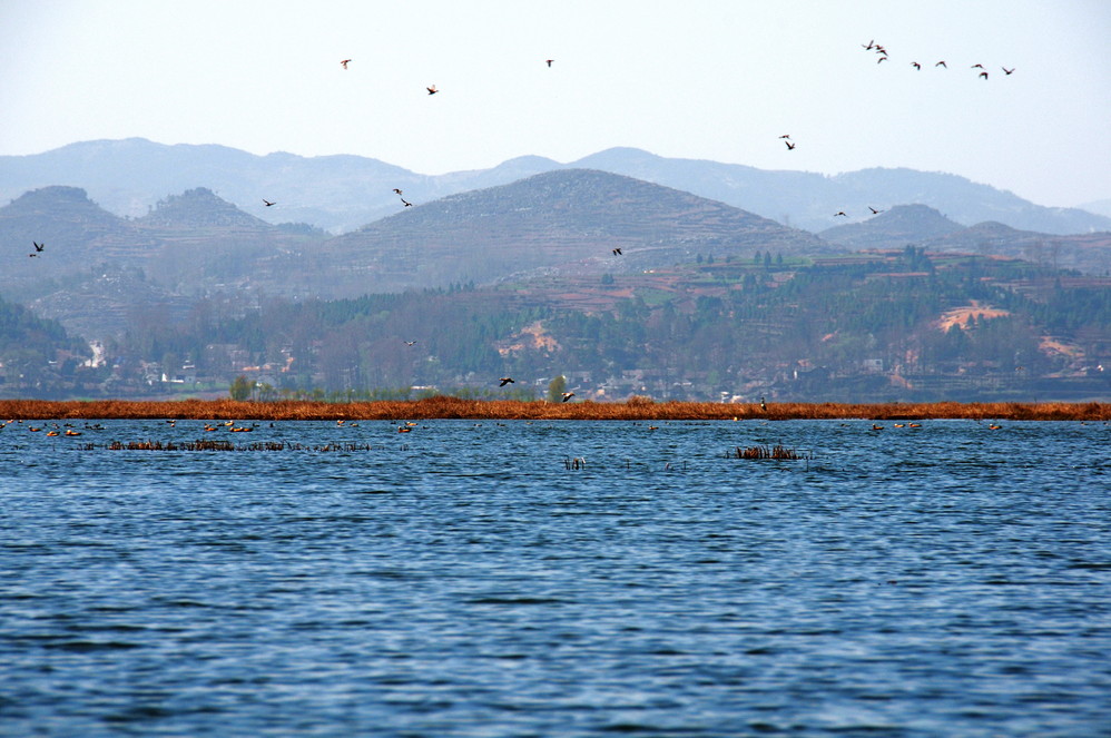 可能是我们来的季节不对头,我们只是见到许多鸳鸯和寥若晨星的几只鹤,也不知道是啥品种,反正就不是珍稀的黑颈鹤。鸳鸯倒是双双对对在湖面上卿卿我我,我们的船一靠近,这些家伙们就拿屁股招呼客人,拍人家屁股总不太礼貌!顶着毒毒的大太阳,在湖上泛舟确非美事。加上船夫不厚道,索然而返。