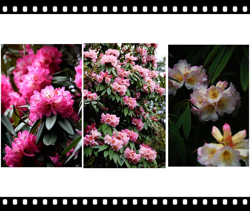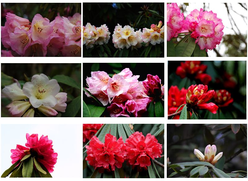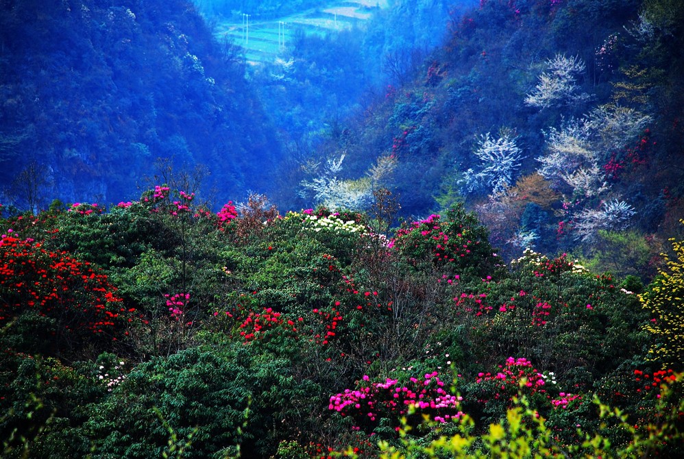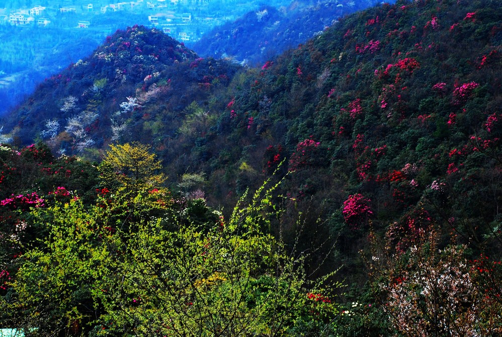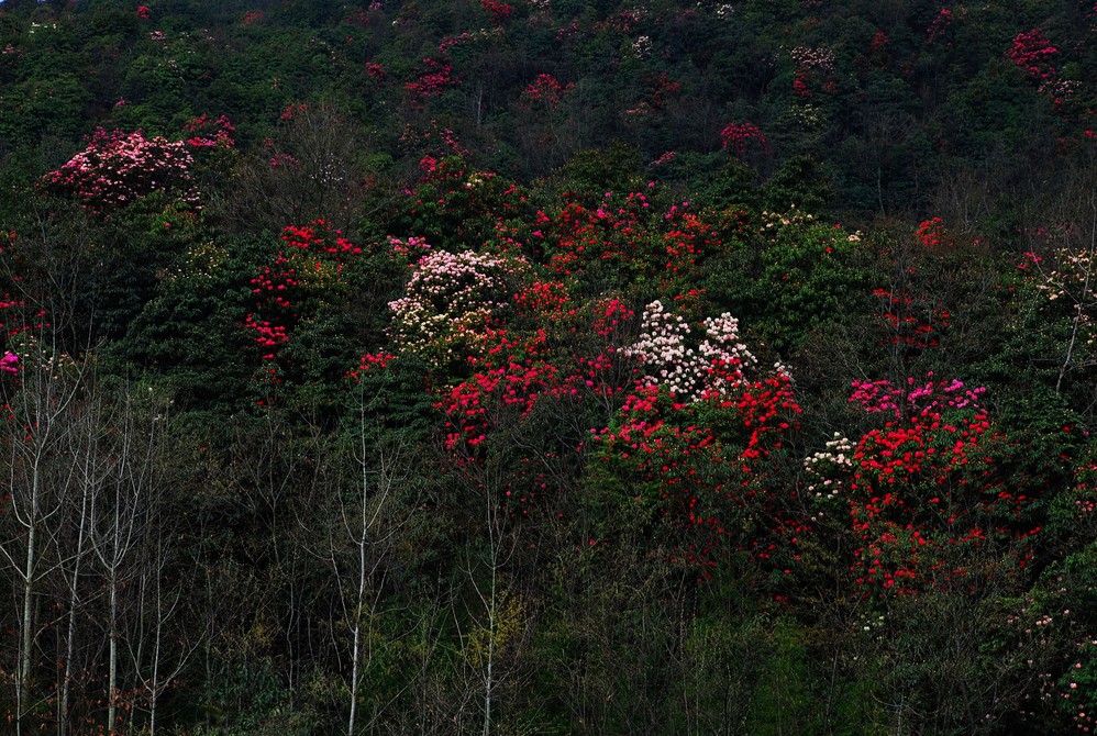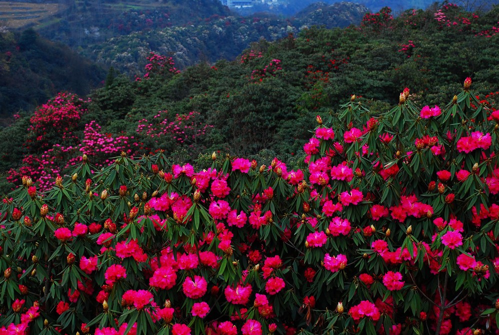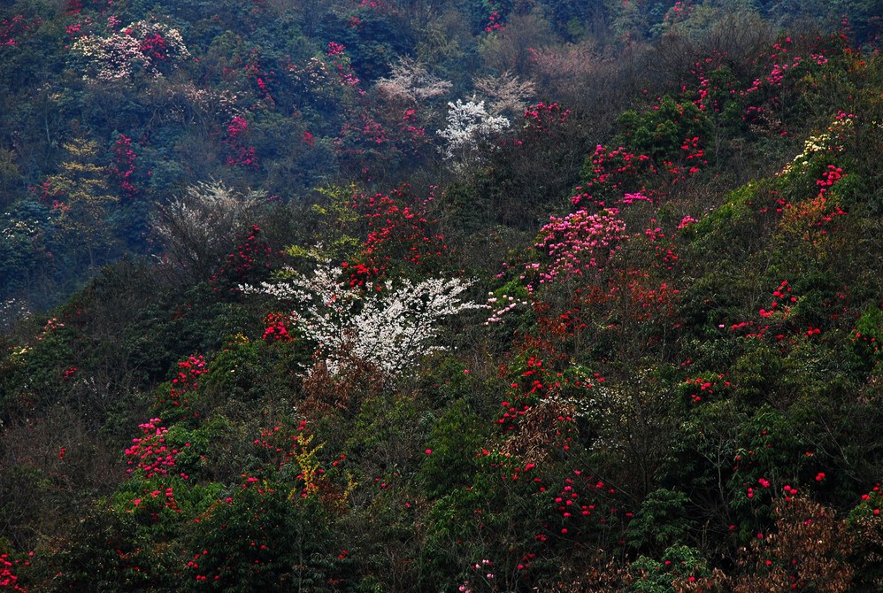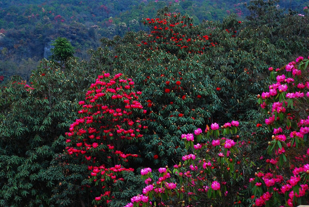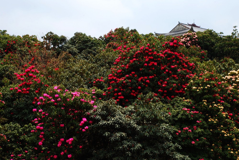 每当春夏之交,满山杜鹃花盛开,灿若彩霞。大杜鹃树高丈余,枝干苍劲盘曲,花朵宛如织锦;小杜鹃高约尺余,俏丽芬芳,玲珑可爱。有殷红的马缨杜鹃,鹅黄的团扇杜鹃,银白的粉球杜鹃,还有罕见百合杜鹃、青莲杜鹃、紫玉盘杜鹃等,其中名贵品种就有17种,真可谓色彩班斓,万紫千红。