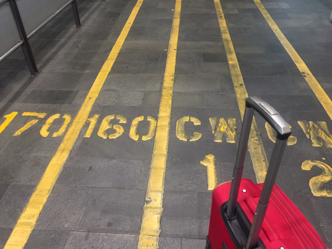 到楼下,要按照自己的票上的车的名字,沿着黄线去排队,不要上错车。我当时是CW1。