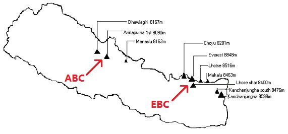 世界十大高峰里有8座在尼泊尔。尼泊尔北部的喜马拉雅山脉汇集了世界顶级的雪山徒步路线,是所有徒步、雪山、摄影爱好者的天堂。其中最负盛名的两条徒步路线就是EBC(Everest Base Camp 珠峰大本营)和ABC(Annapurna Base Camp 安纳普尔纳大本营)了。我们去的EBC路线聚集了四座8000m+的雪山(第一高的珠峰,第四高的洛子峰,第五高的马卡鲁峰,和第六高的卓奥友峰),和十几座7000+和6000+的雪山,风景要好于ABC,可以算是世界上雪山风景最好的徒步路线了,但是海拔较高,日程较长,所以难度也较大。