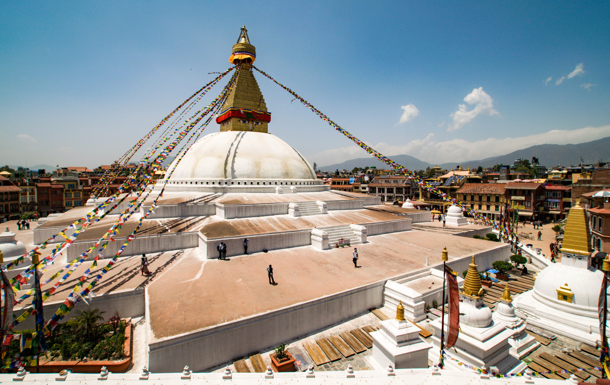 补充完徒步装备,我们直接打车去了博德纳(Boudhanath Stupa),世界最大的圆形佛塔。从泰米尔打车过去500卢比,门票250卢比。佛塔四周有各种商店和饭馆。