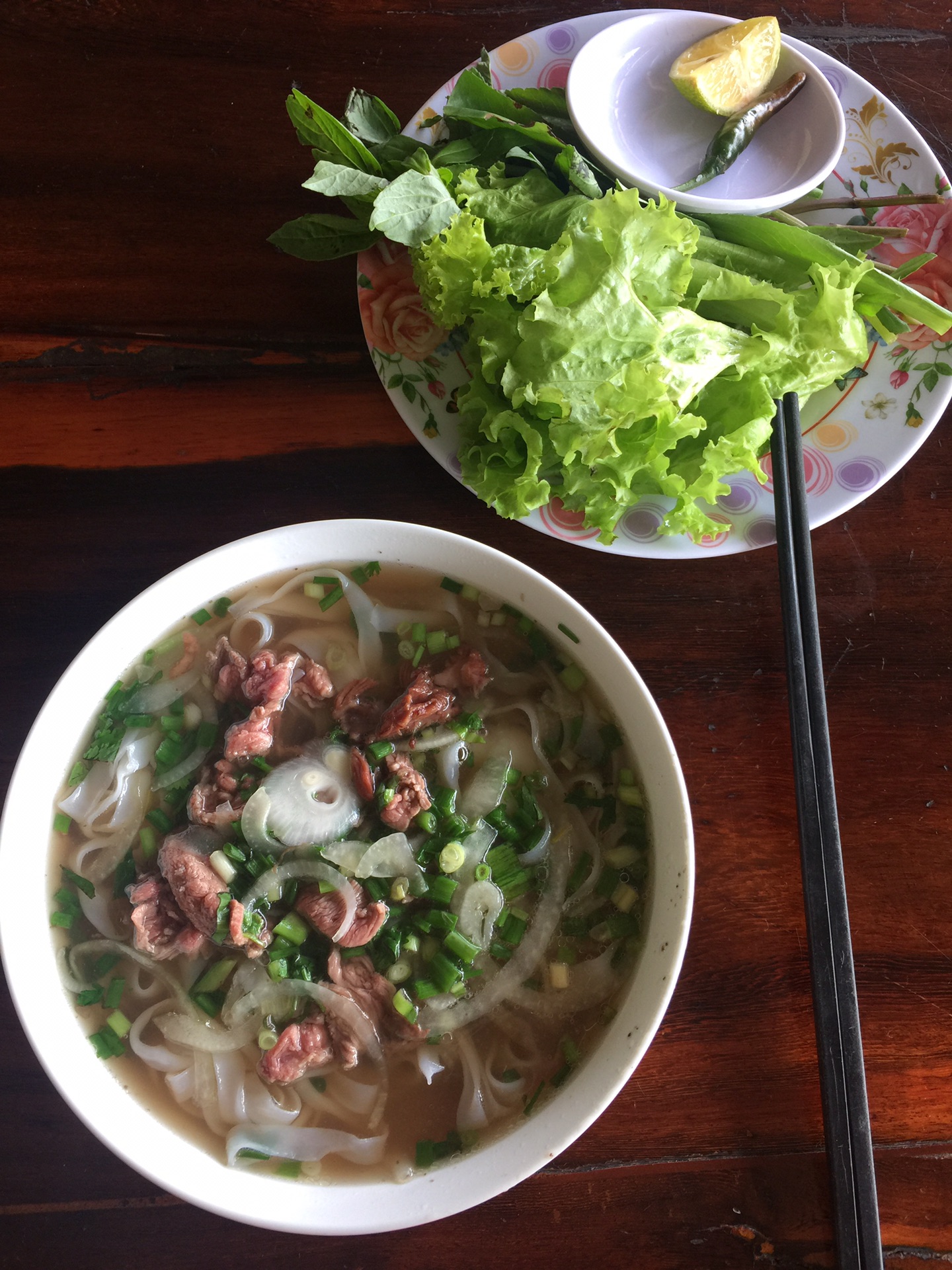 PHO,读音类似“佛”,按形状和味道来说,与中国的河粉相似度99.9%。上图是在街边小吃店点的。汤底是牛肉汤,主料是PHO,上面漂着几片牛肉,另附一碟罗勒叶和青菜,半个柠檬和一个小辣椒。这就是基本配备。有些人要再加一点鱼露,加一点辣椒酱,有些人会再要几块烤肉串同食。