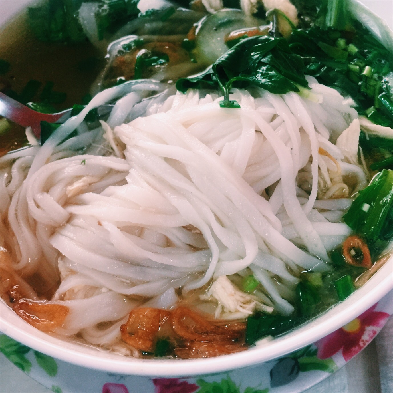 这是改良过的PHO,“鸡丝河粉”,汤底是鸡汤,牛肉改成鸡丝,撒了过油的蒜粒和小虾。每家做法都会有不一样,不变的是,主料都是PHO,汤是真材实料熬制,清爽不油。