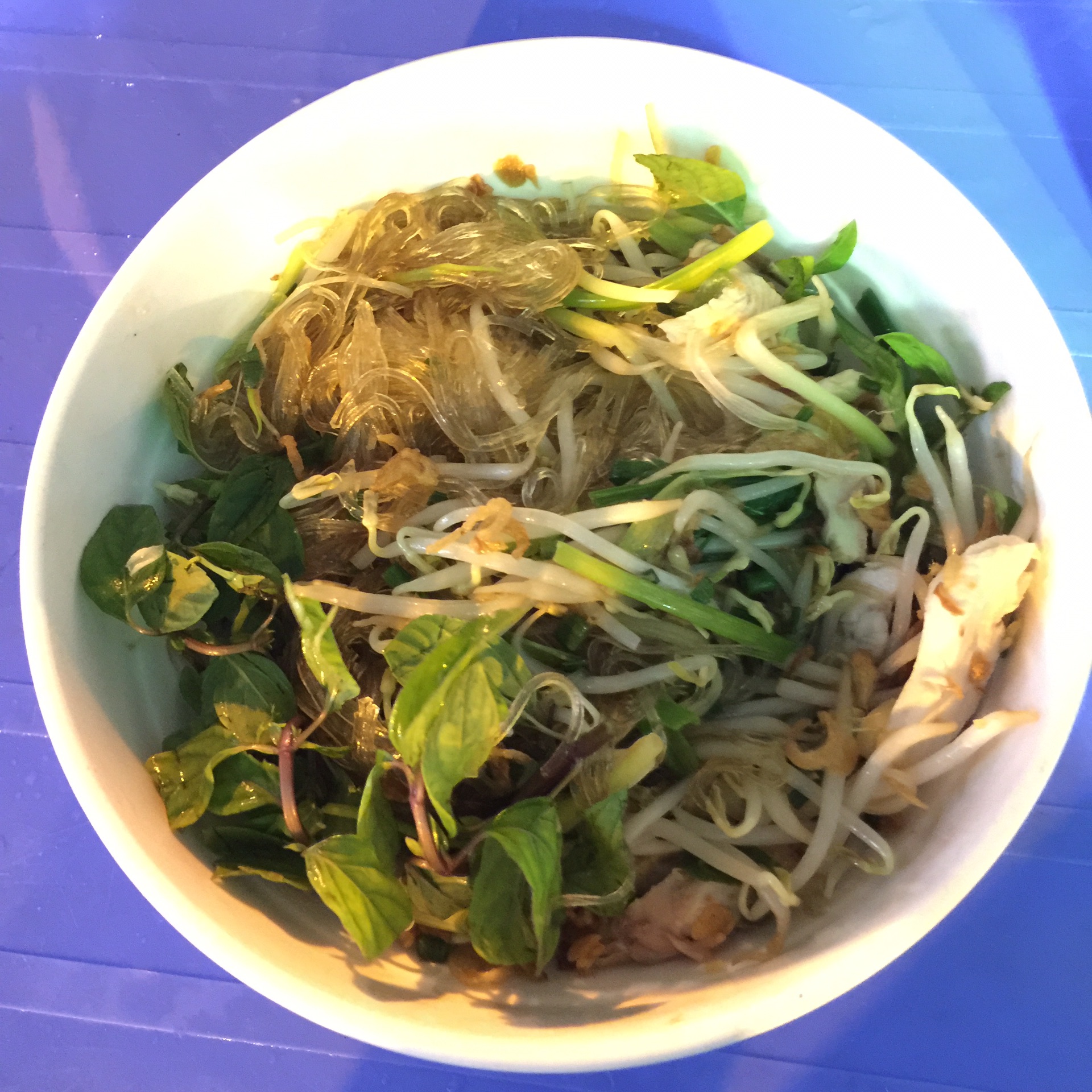 我吃过一次,就是上图,干捞,半碗豆芽半碗红薯粉,一点鸡丝,一把葱和几片罗勒叶,一点蒜粒和花生碎在碗底。