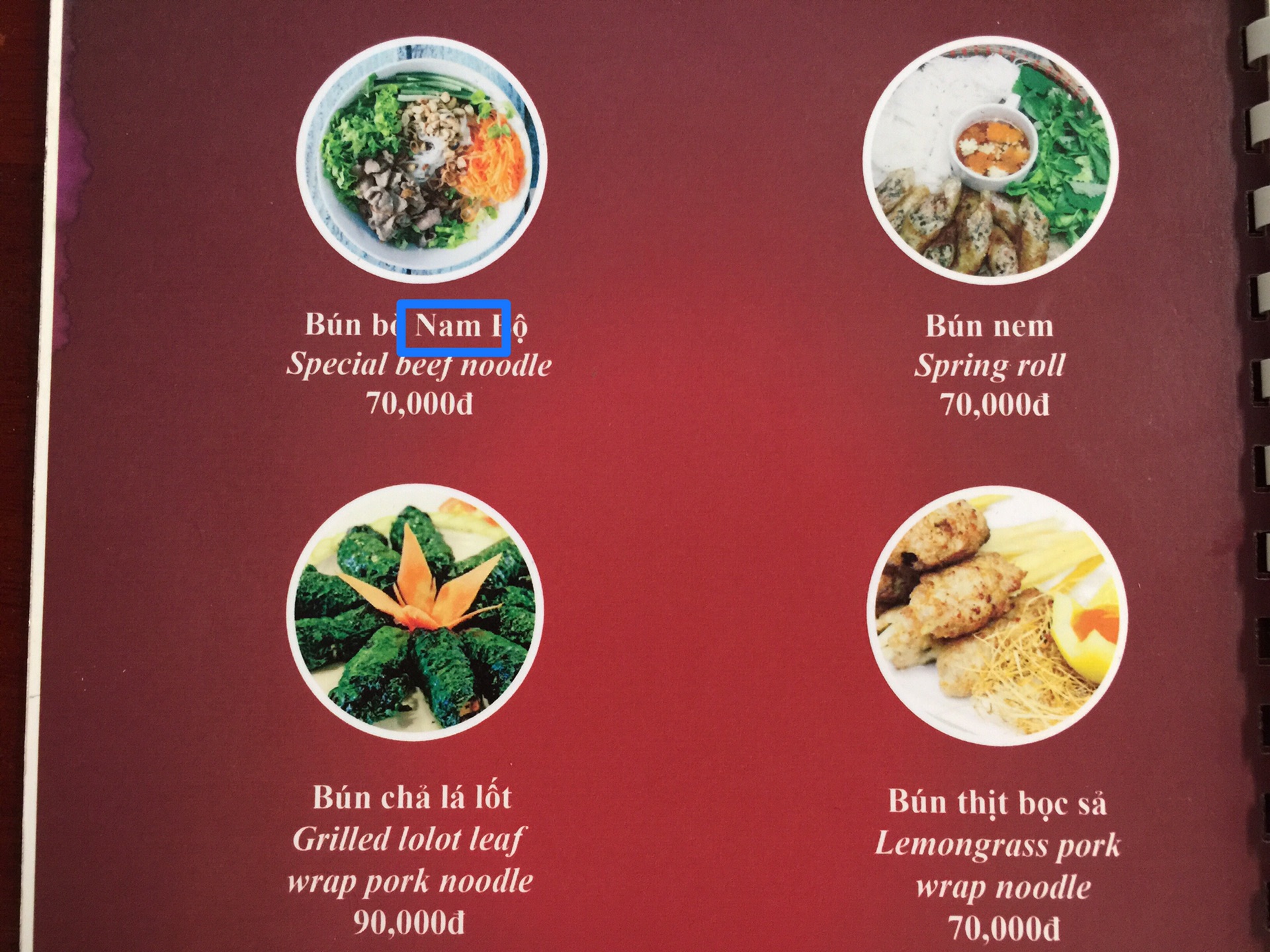 看蓝框的内容被英文翻译成了,“特别的牛肉米线”,而且,我也没有在任何一间餐厅的菜单上看到有把nem直译成south,都是special。