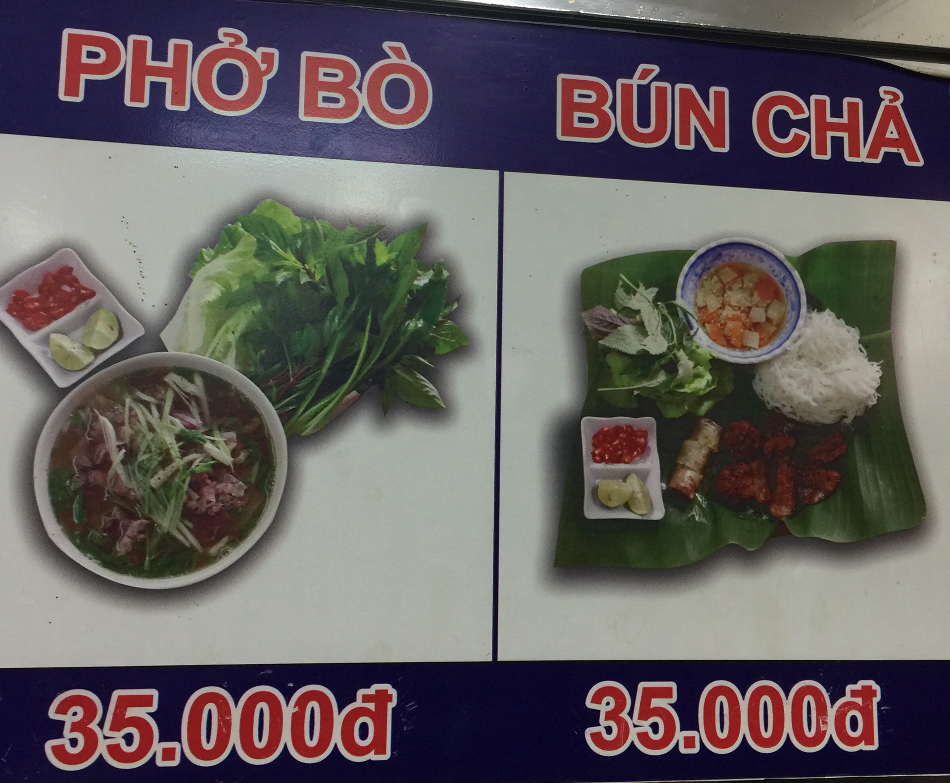 上一张图左边写着PHO BO,就是牛肉汤粉,BO是牛肉。右边写着BUN CHA 是米线肉饼套餐,CHA,当地人说是肉丸的意思,我理解是加工过的肉制品,有些店烤一块肉,也是这个CHA的单词。