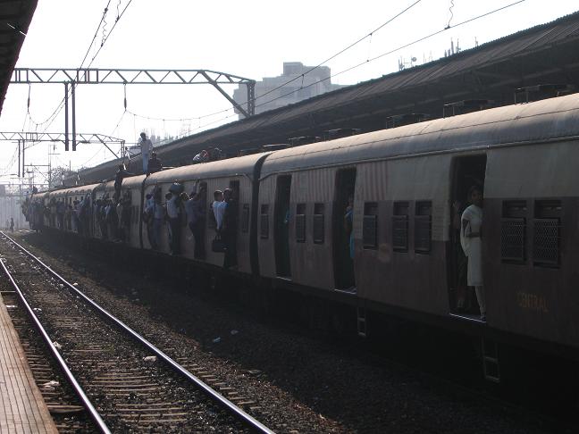 上午坐城间列车去孟买 火车站,城间列车很便宜但较挤,印度 人就象铁道游击队一样扒着车门,上下自如。