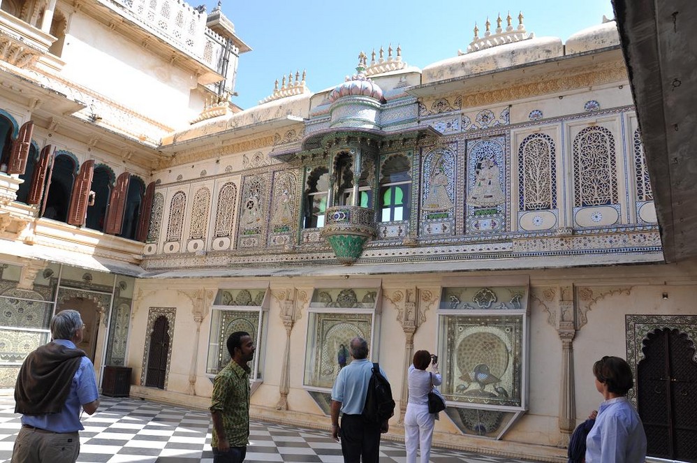 在乌代布尔 住的旅馆较满意,房间干净又便宜,在晒台上可以看见水上 宫殿,我们照了不少夜景。我们还参观了城市宫殿 和贾格迪什神庙。