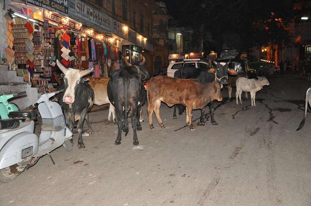 印度 教中将牛奉为神牛,牛在马路上悠闲漫步,人和车都要避让。