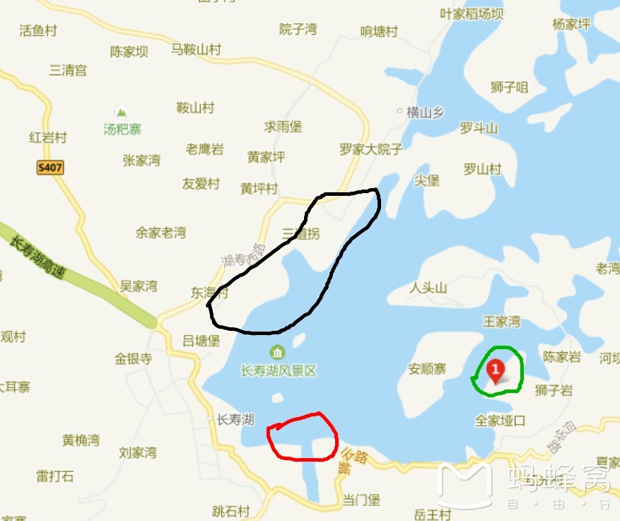 这次来长寿湖,主要去了三个地方。一是绿色圆圈的夜钓场,就是本次住宿的地方;二是红色圆圈的狮子滩电站大坝;三是黑色圆圈的长寿湖公园。