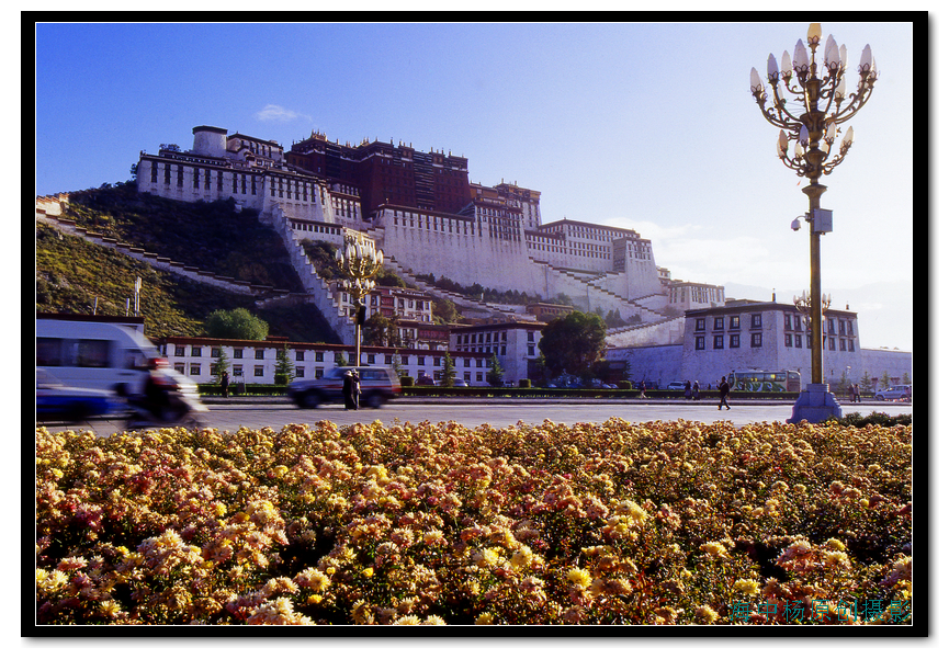 从广场上看布达拉宫,在鲜花簇拥下,蔚为壮观。